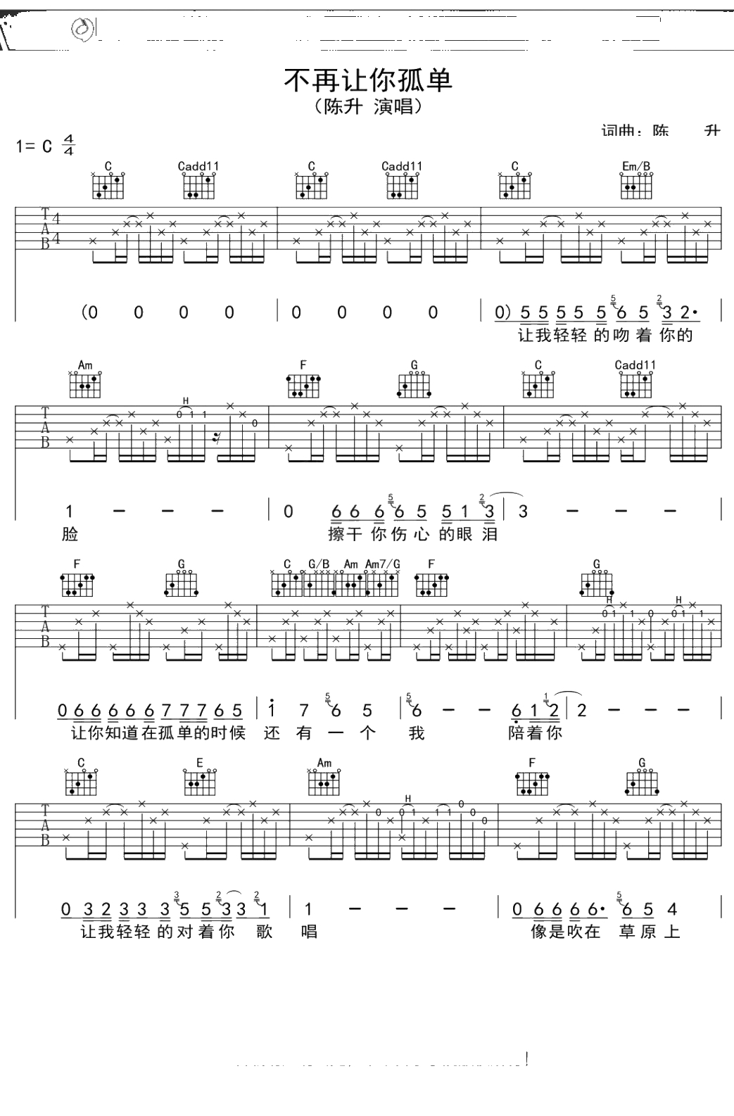 陈升《不再让你孤单》吉他谱 C调弹唱六线谱