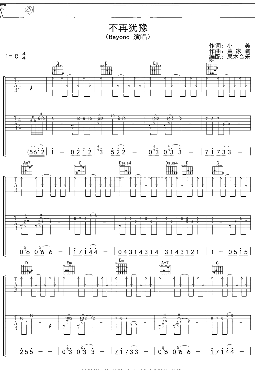 beyond《不再犹豫》吉他谱 C调弹唱六线谱吉他谱