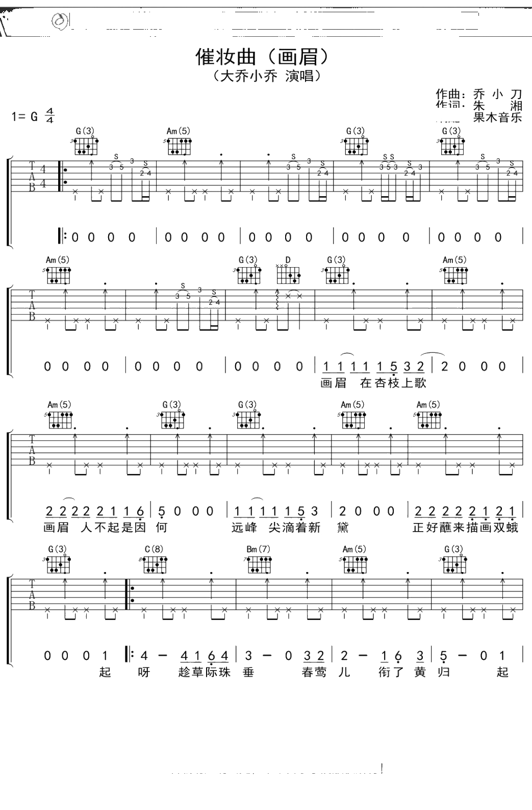 大乔小乔《催妆曲》吉他谱 G调弹唱六线谱