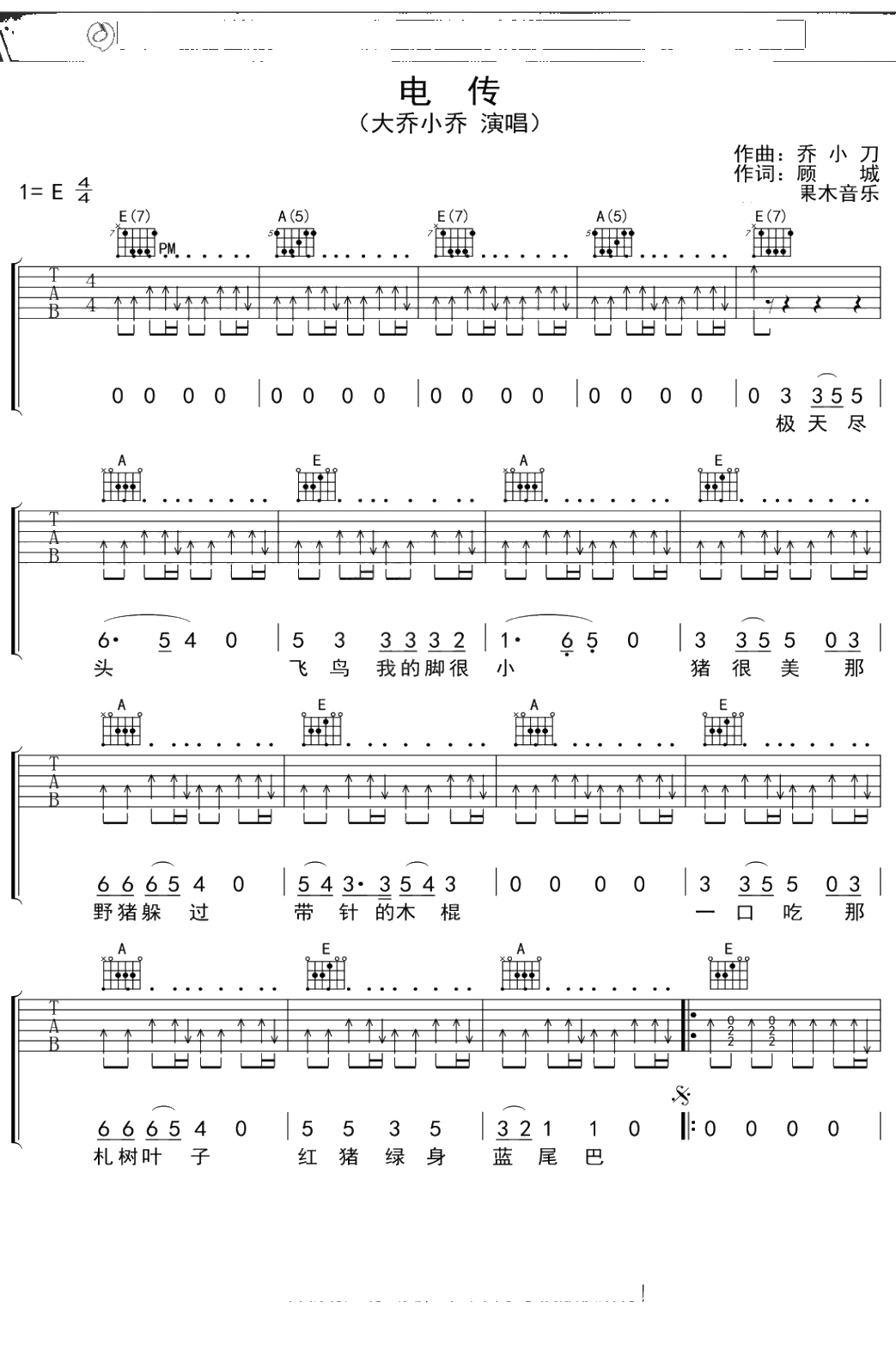 大乔小乔《电传》吉他谱 E调弹唱六线谱吉他谱