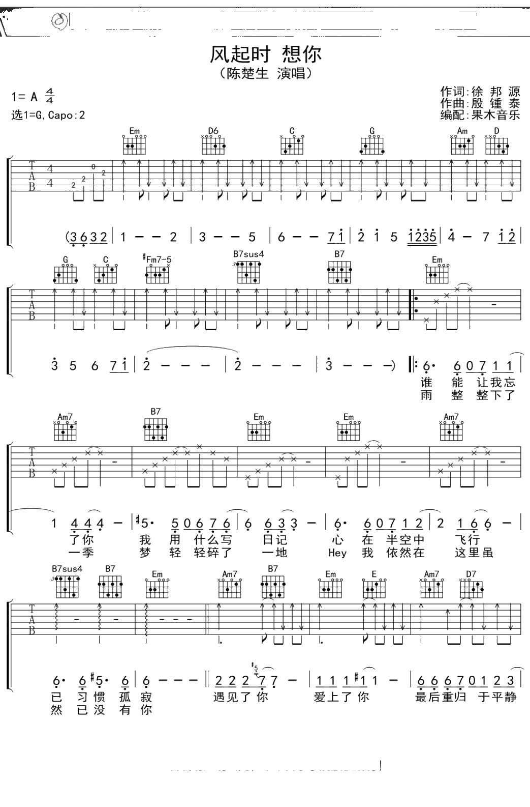 陈楚生《风起时想你》吉他谱 G调弹唱六线谱