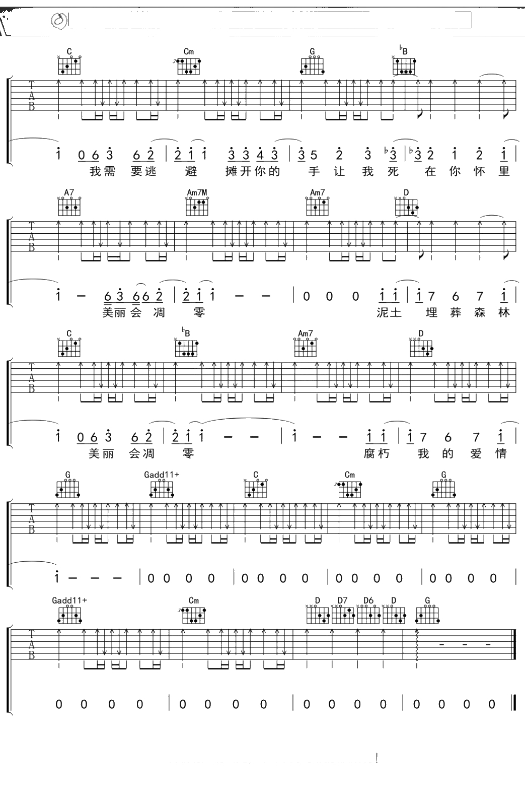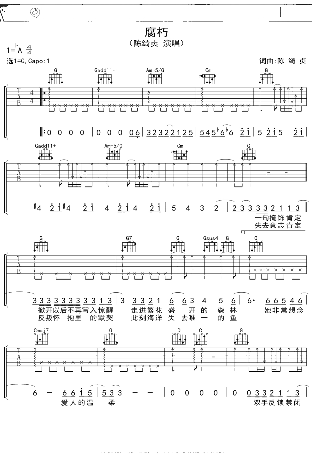陈绮贞《腐朽》吉他谱 C调弹唱六线谱吉他谱