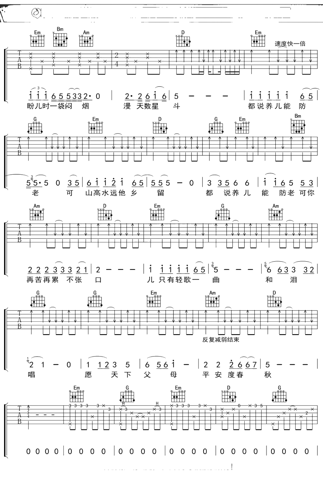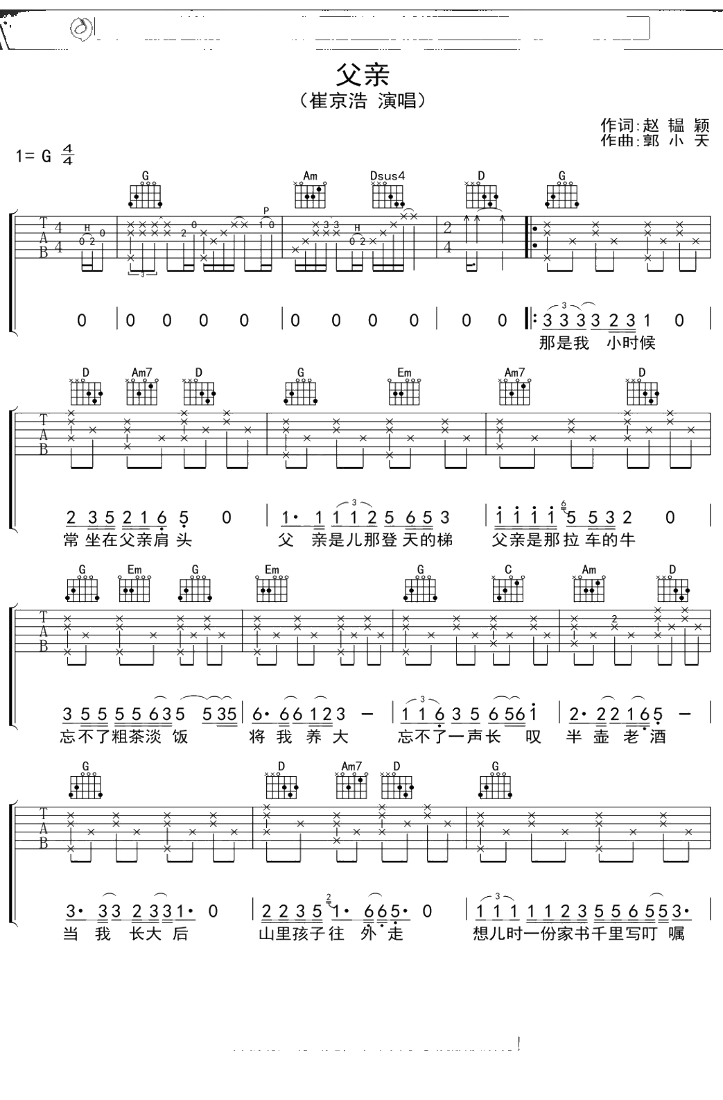 崔京浩《父亲》吉他谱 G调弹唱六线谱