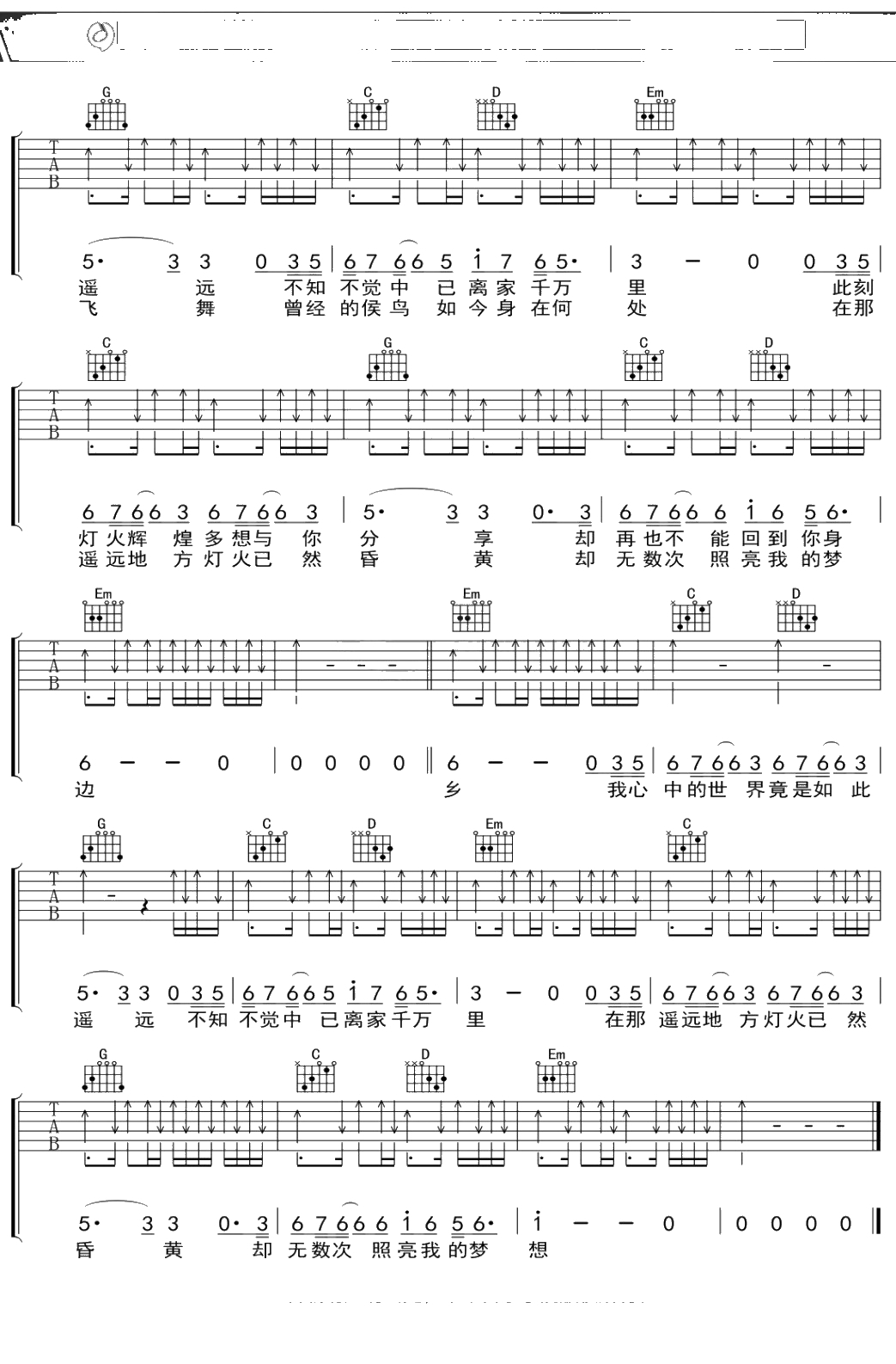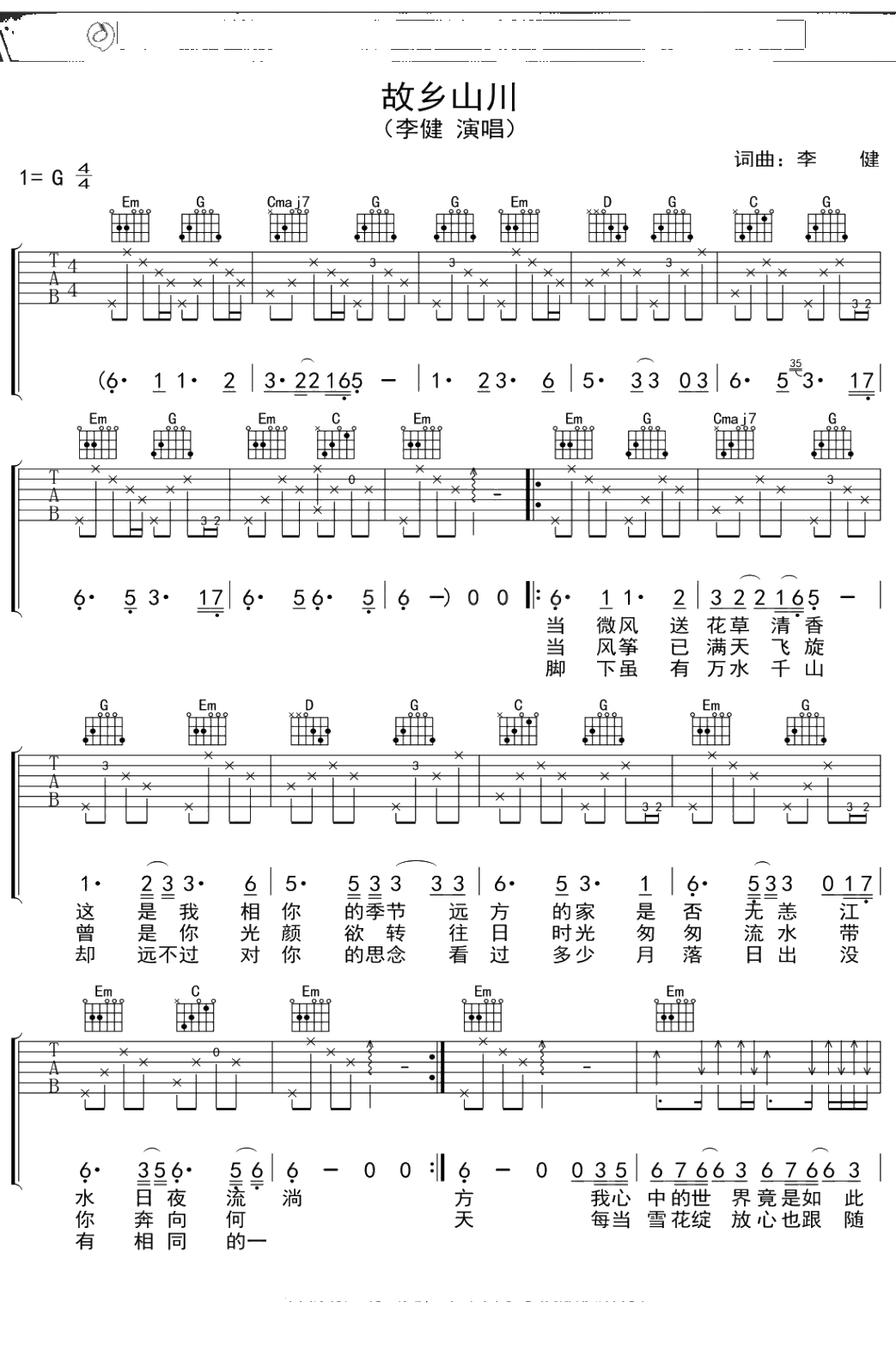 李健《故乡山川》吉他谱 G调弹唱六线谱