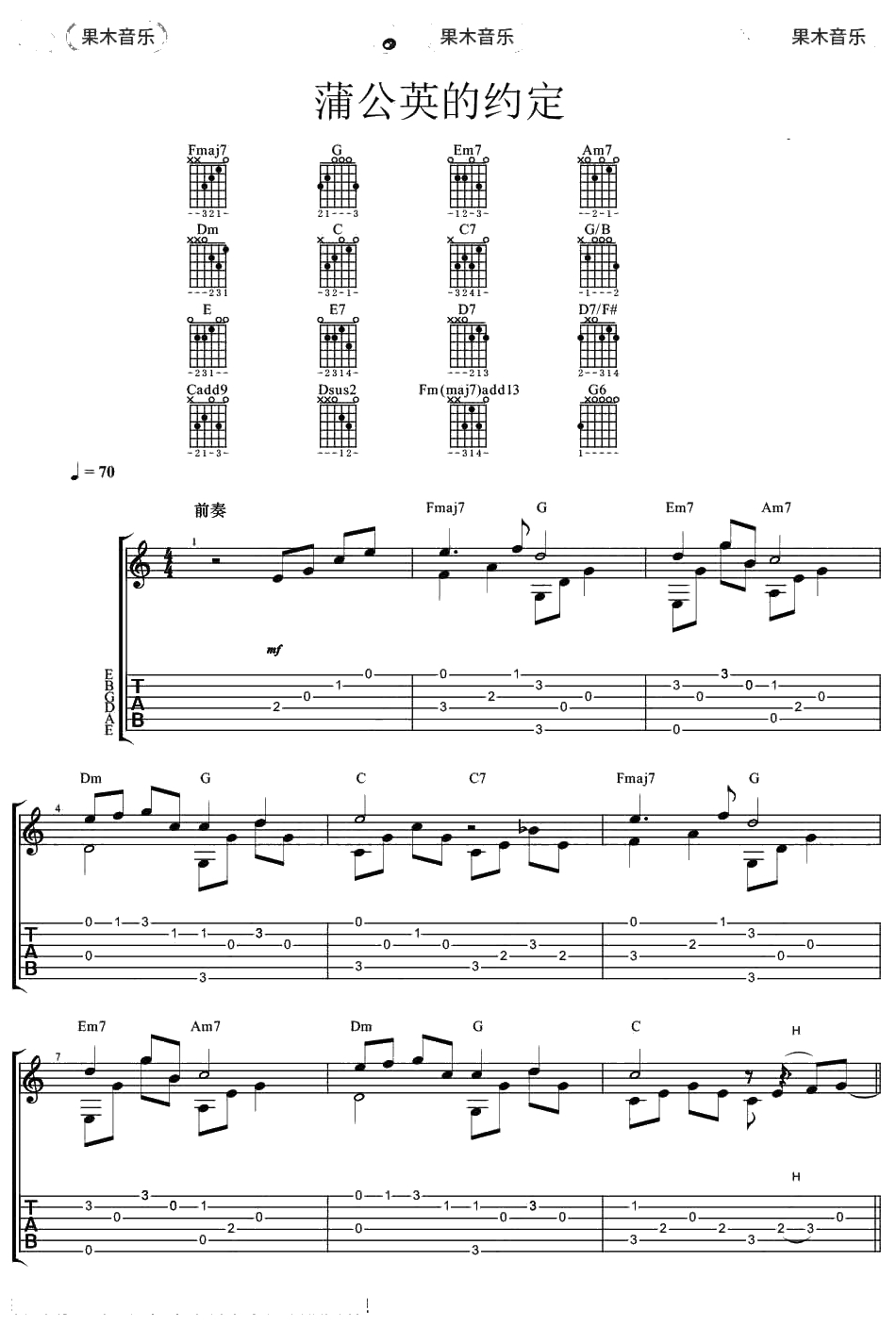 周杰伦《蒲公英的约定》指弹谱 吉他独奏吉他谱
