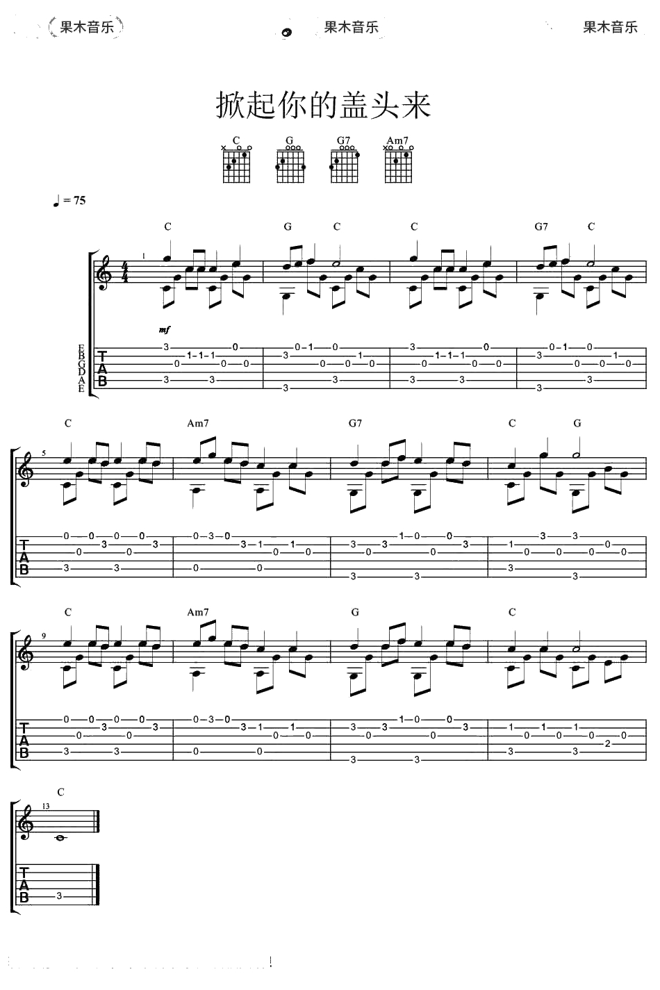《掀起你的盖头来》指弹谱 吉他独奏