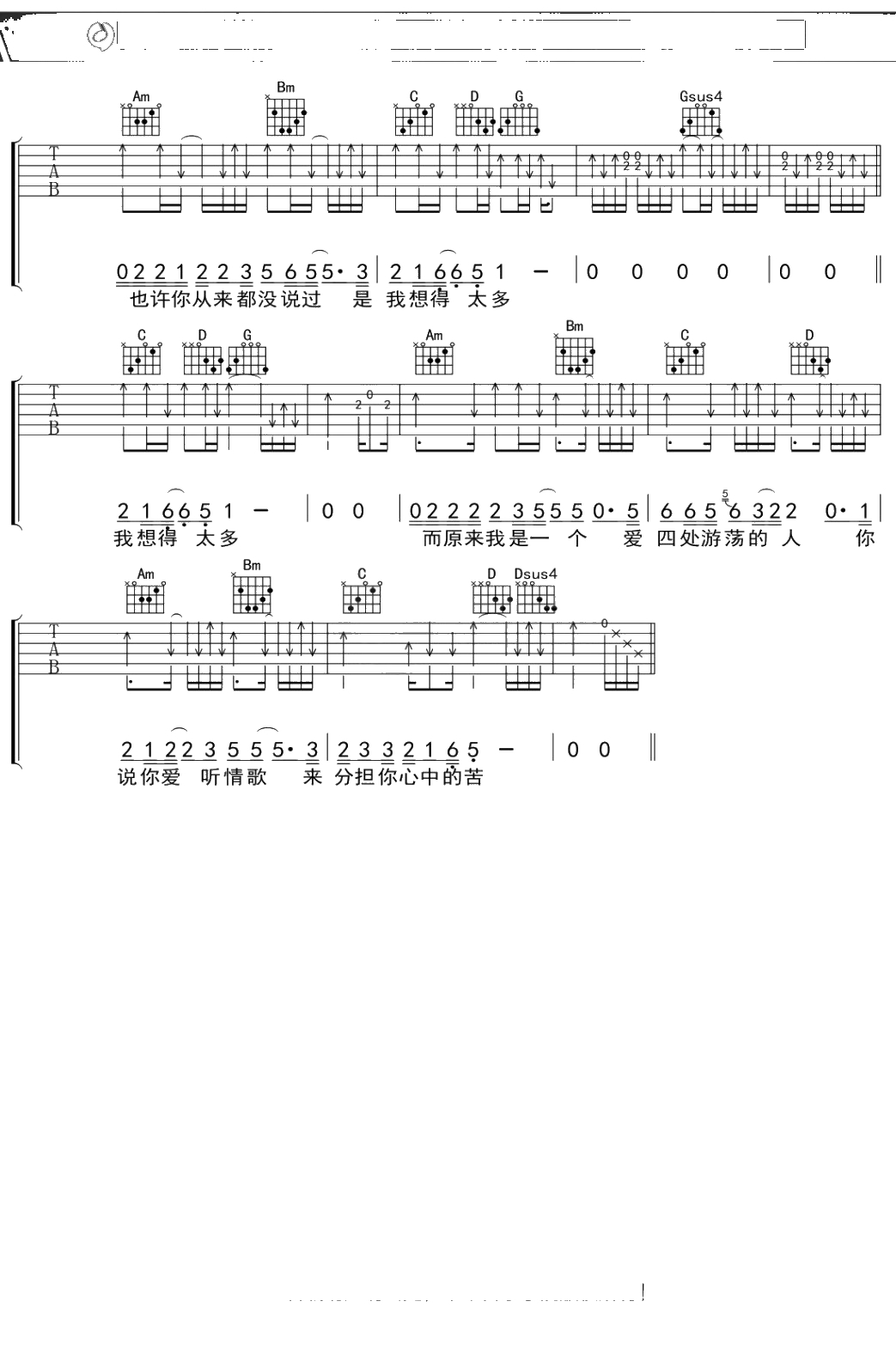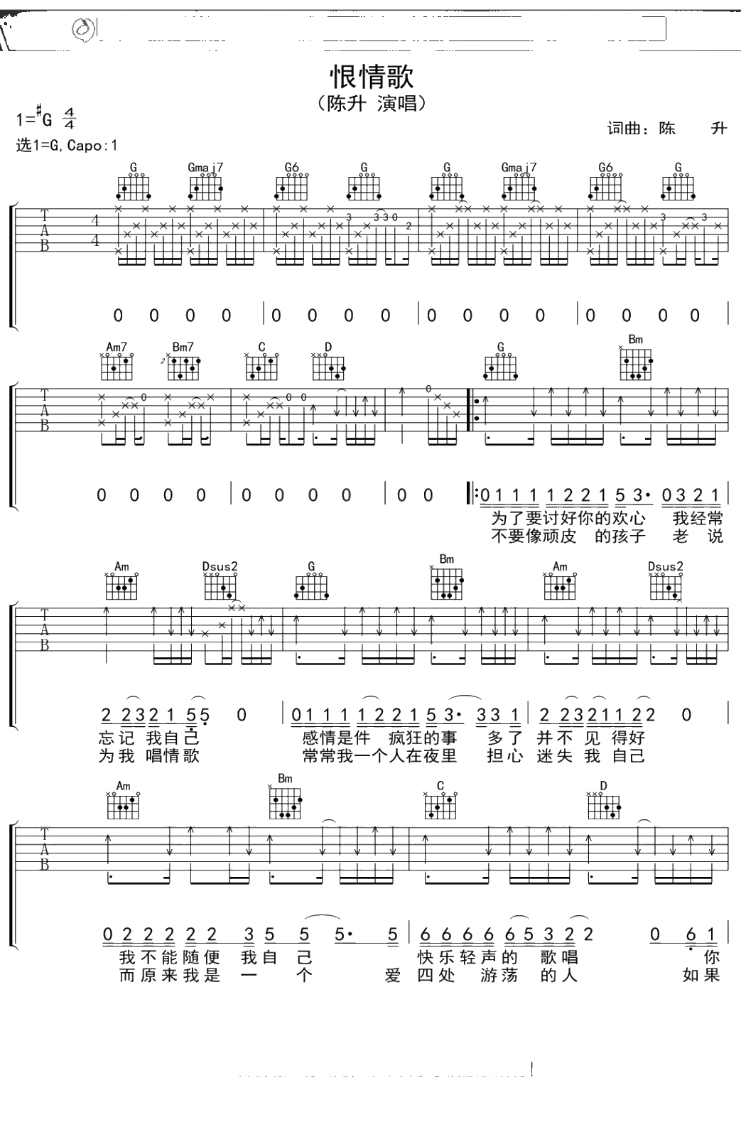陈升《恨情歌》吉他谱 G调弹唱六线谱