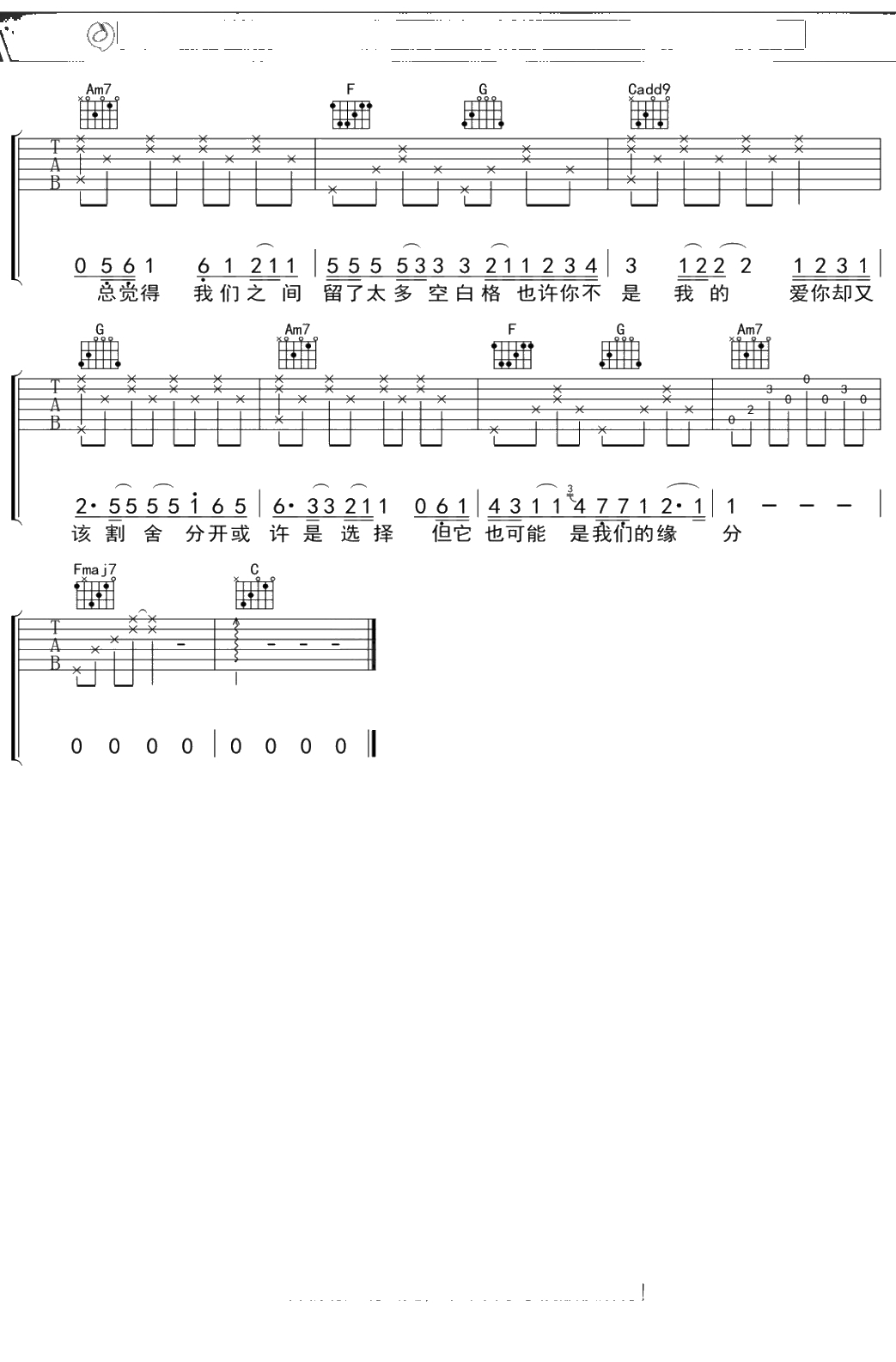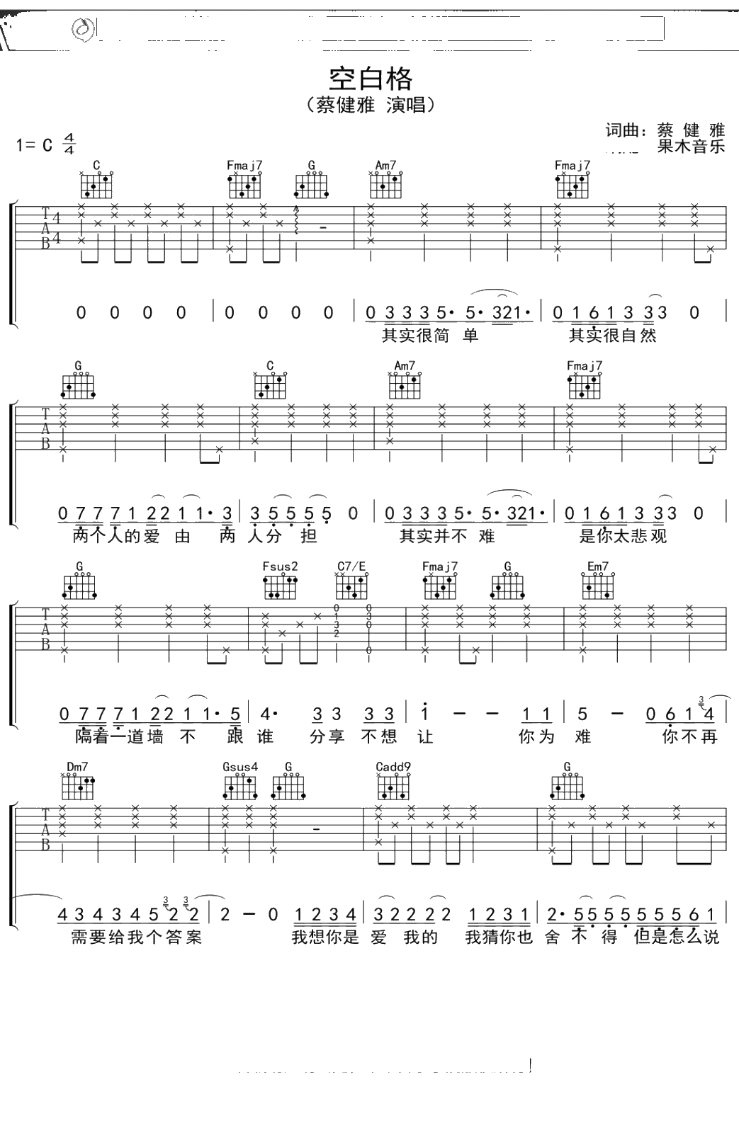 蔡健雅《空白格》吉他谱 C调弹唱六线谱