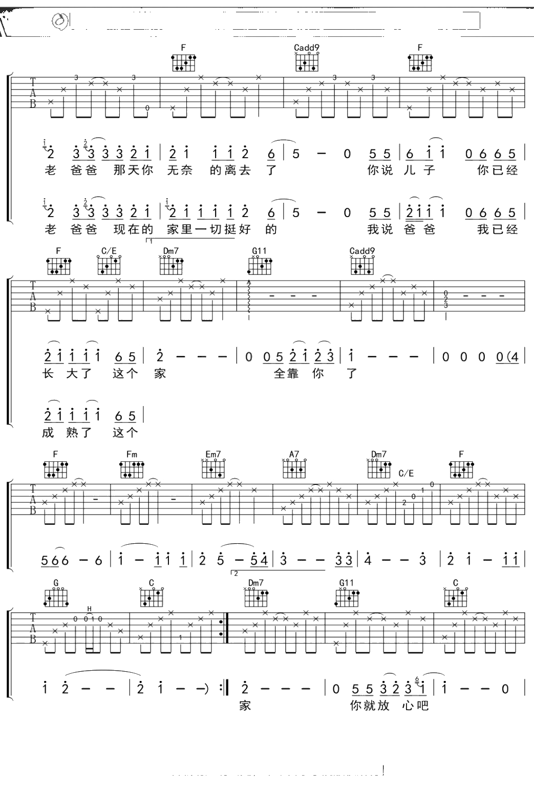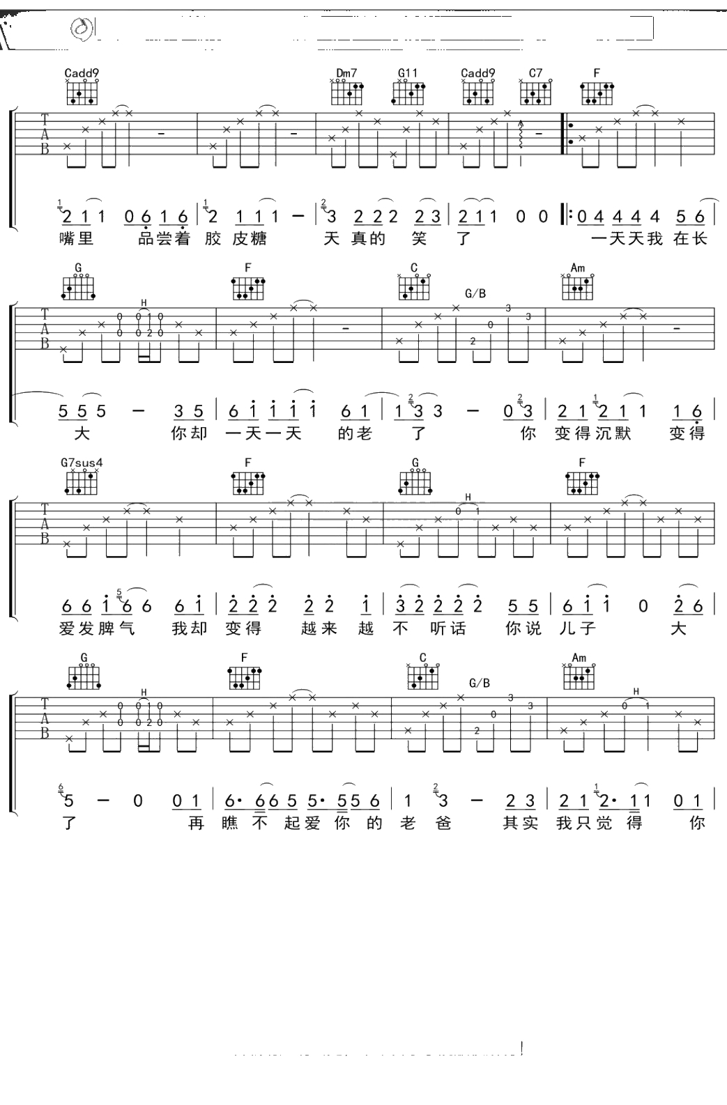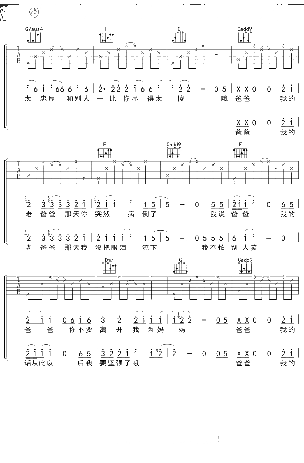 丑钢《老爸》吉他谱 C调弹唱六线谱吉他谱