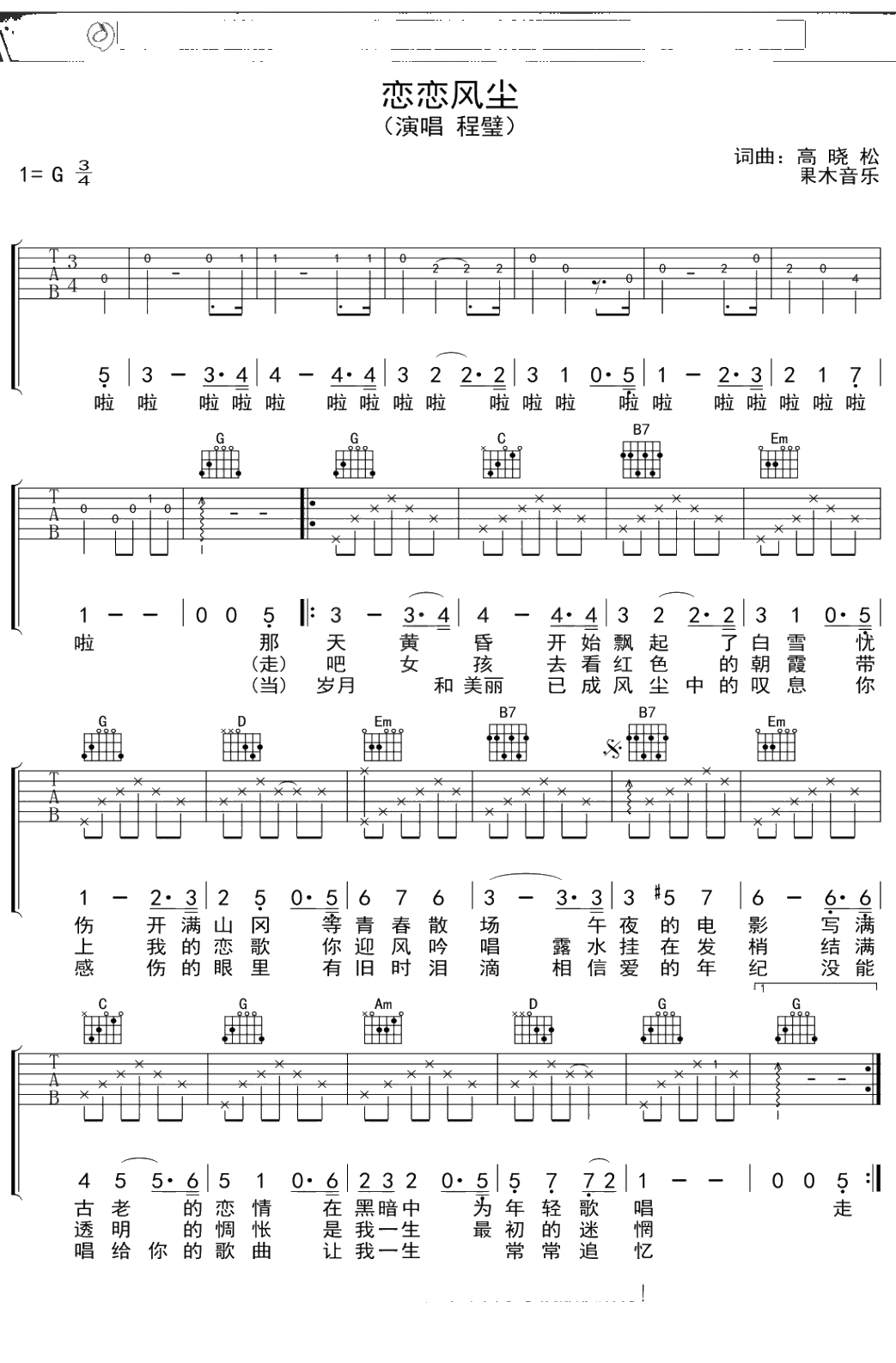 程璧《恋恋风尘》吉他谱 G调弹唱六线谱