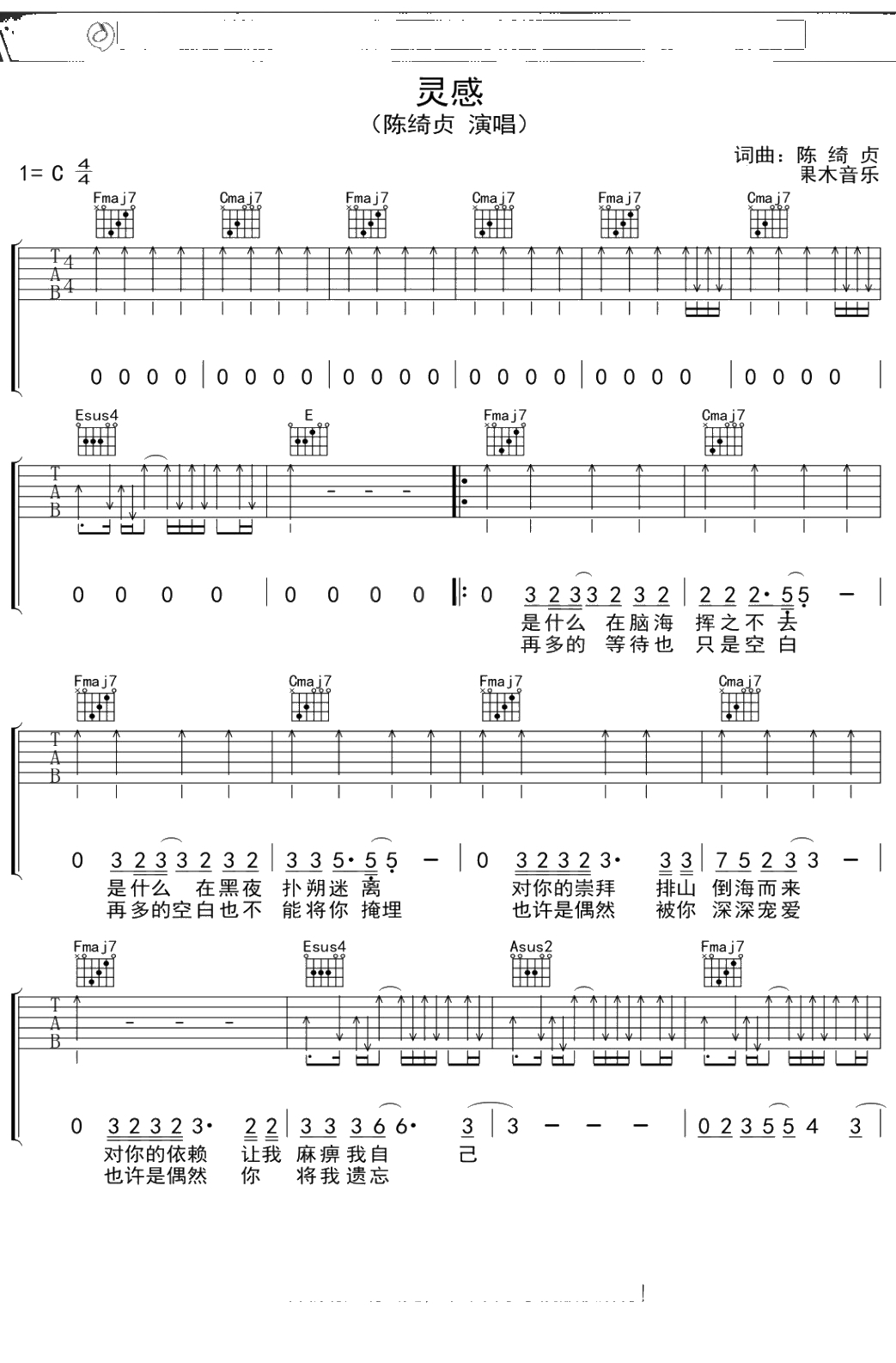 陈绮贞《灵感》吉他谱 C调弹唱六线谱