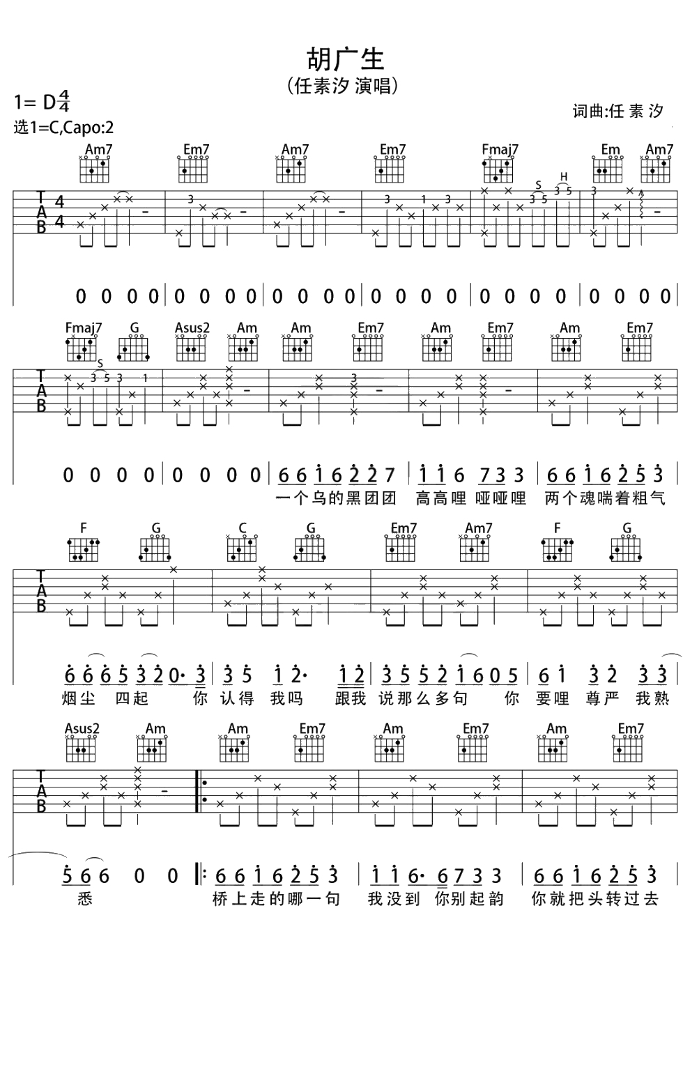 任素汐《胡广生》吉他谱 C调弹唱六线谱