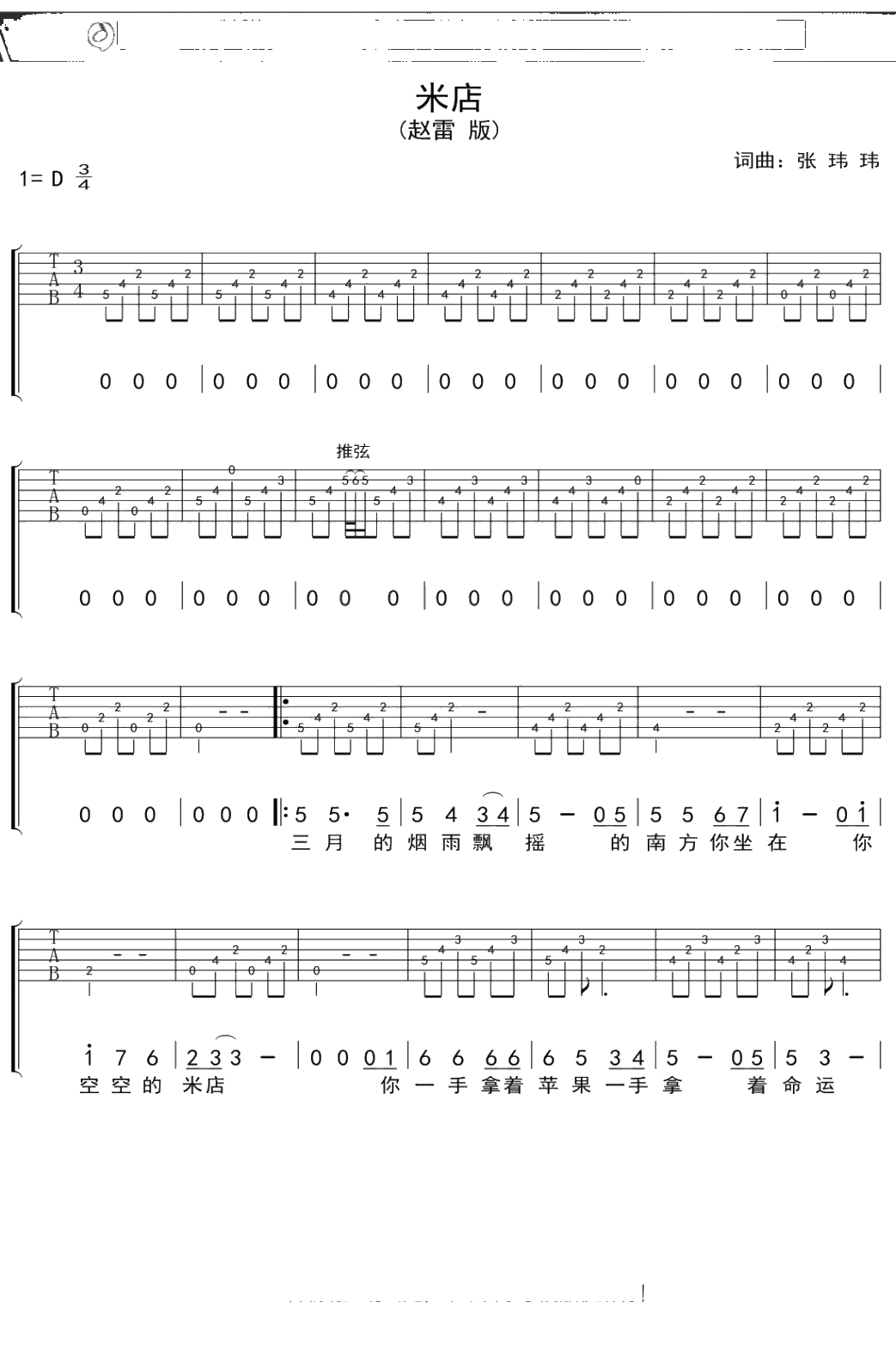 赵雷《米店》吉他谱 D调弹唱六线谱吉他谱