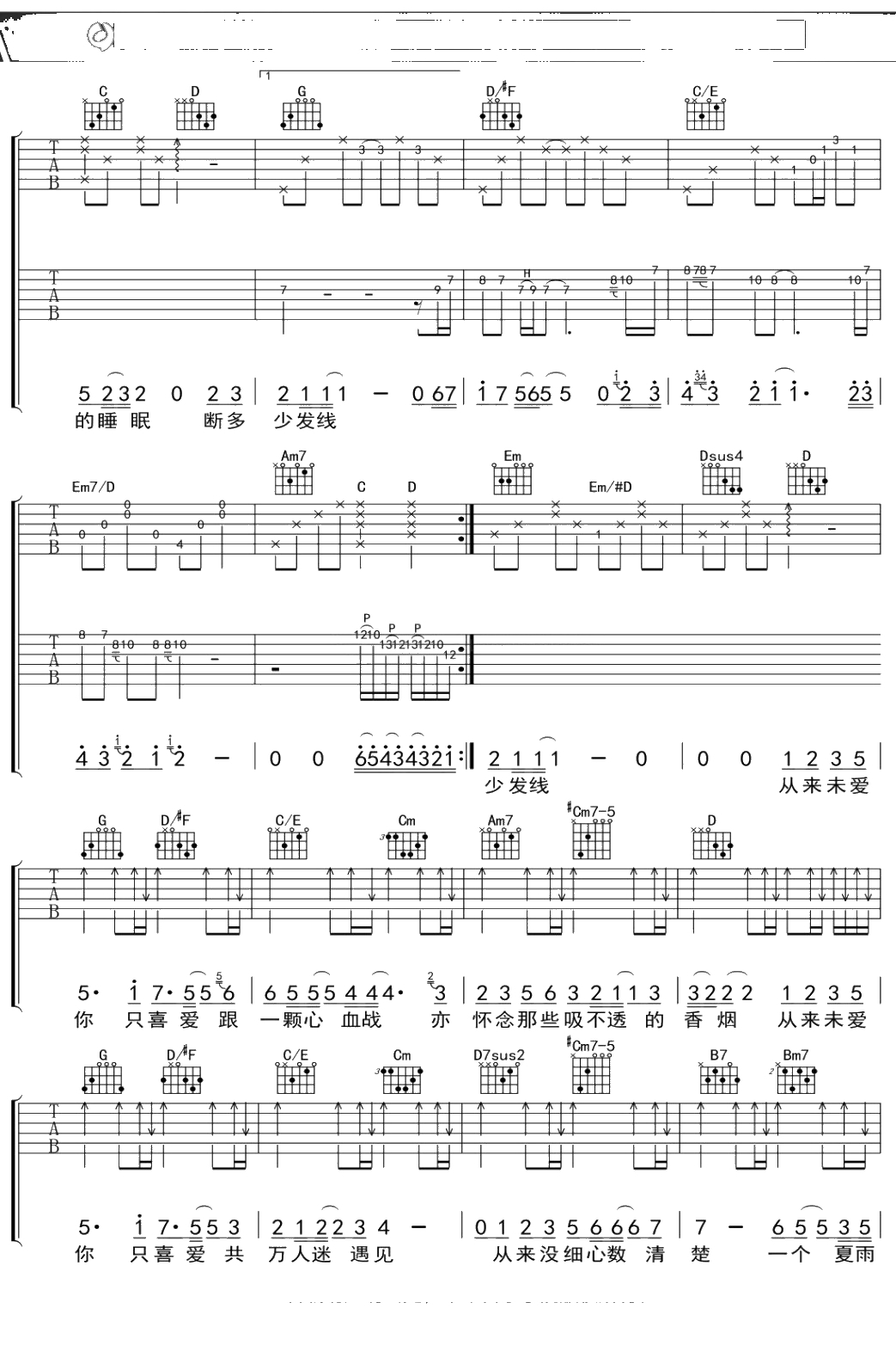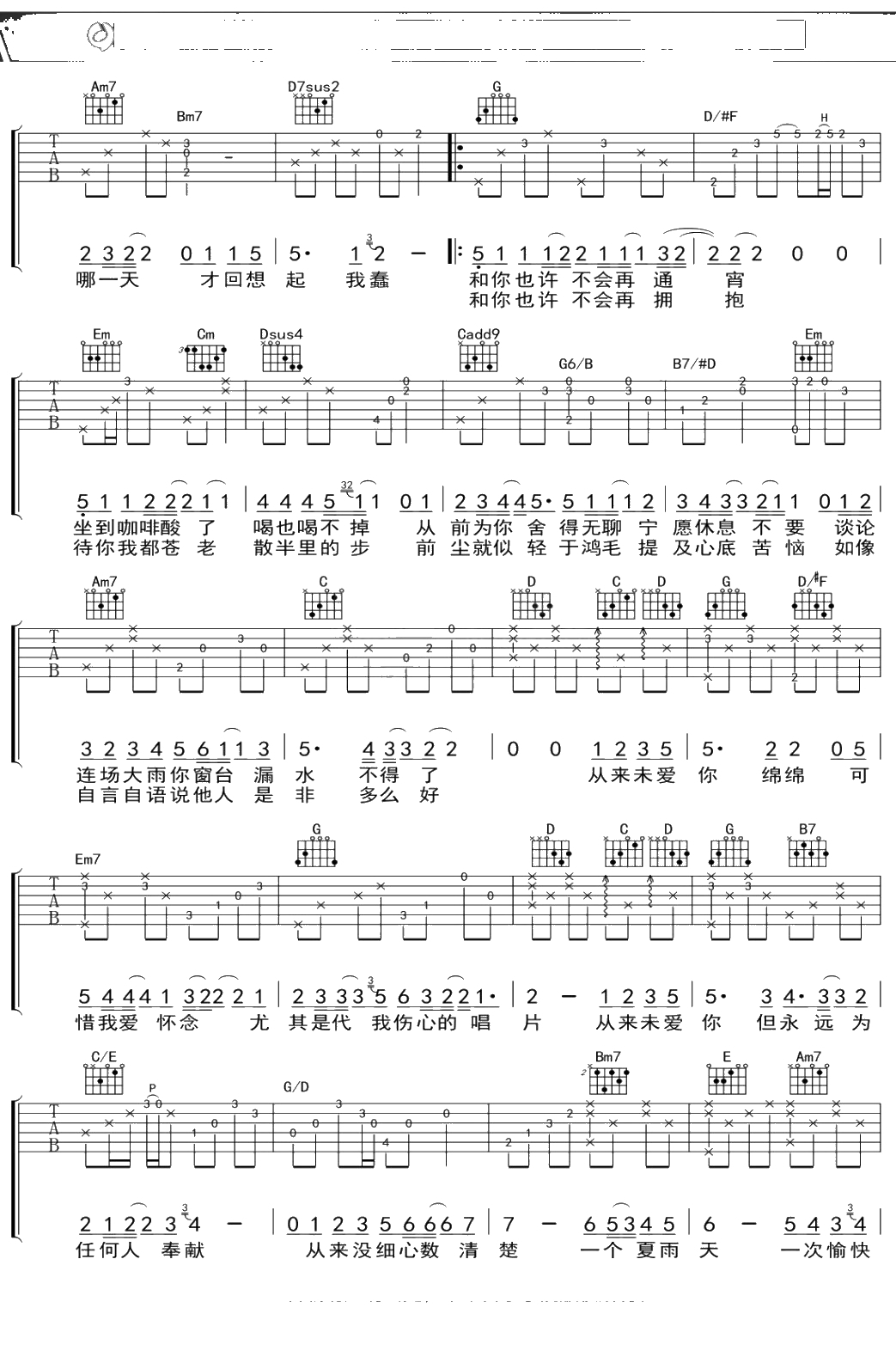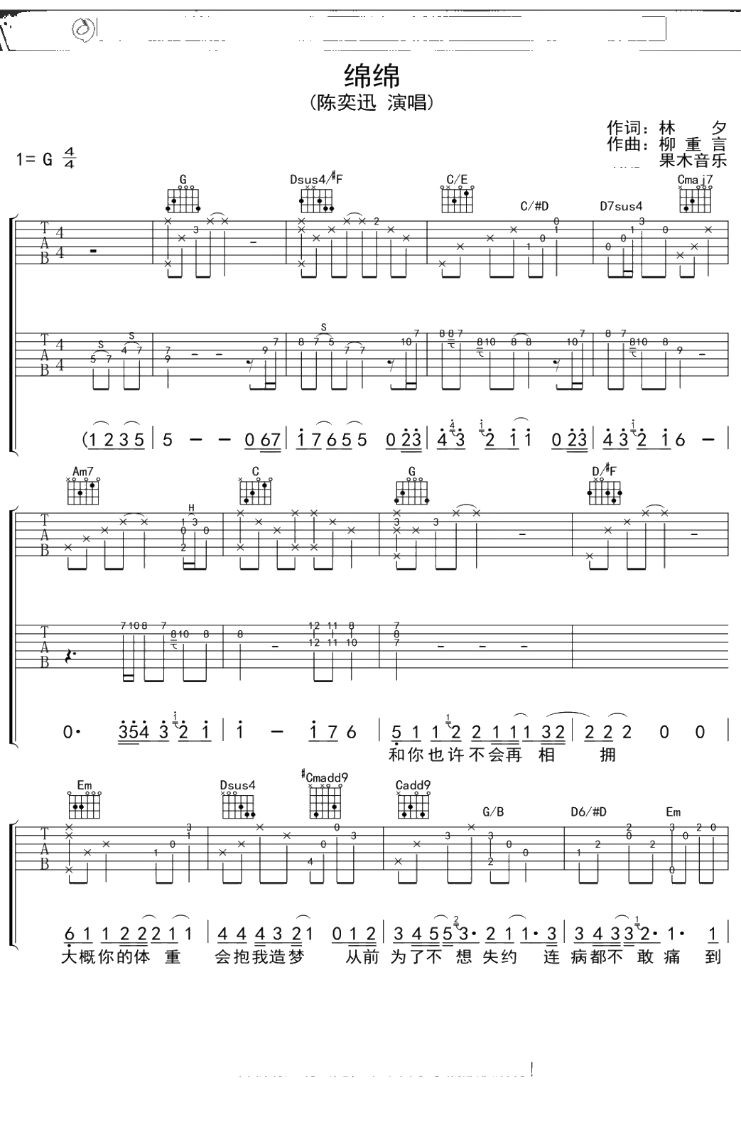 陈奕迅《绵绵》吉他谱 G调弹唱六线谱