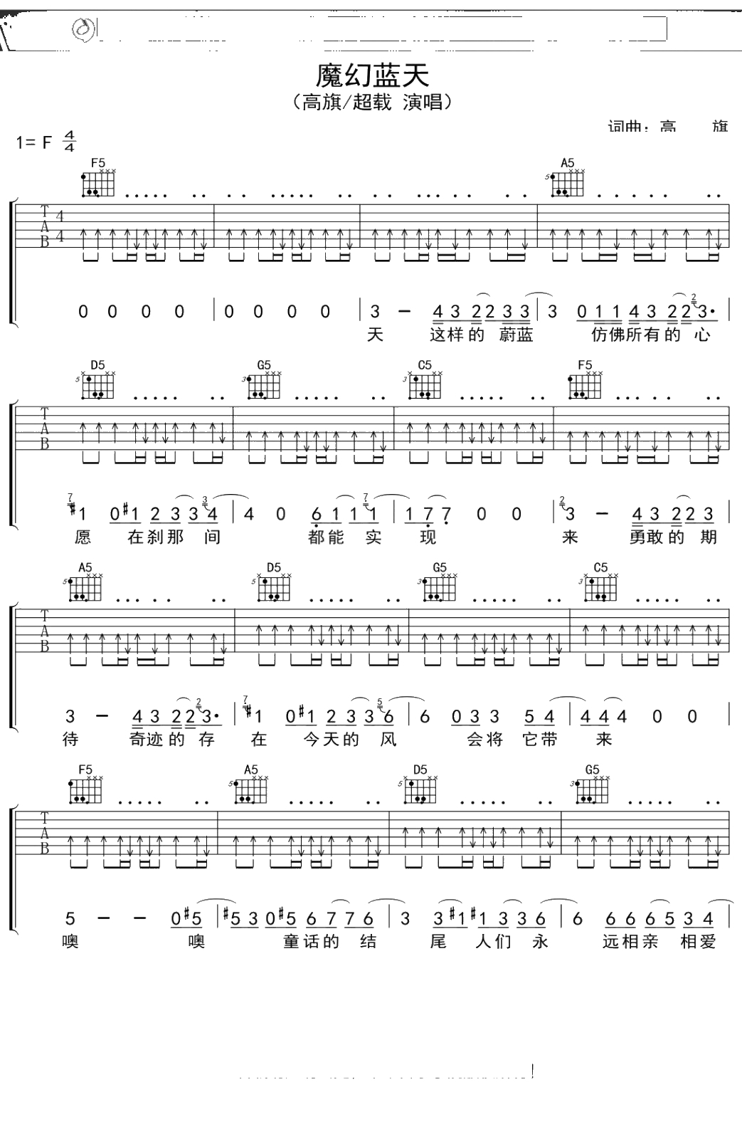 超载乐队《魔幻蓝天》吉他谱 F调弹唱六线谱吉他谱