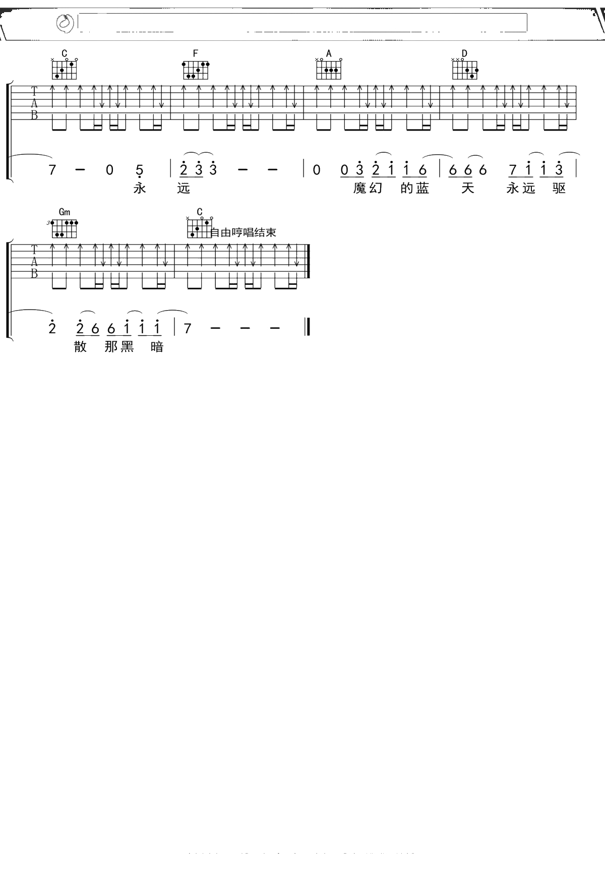 超载乐队《魔幻蓝天》吉他谱 F调弹唱六线谱