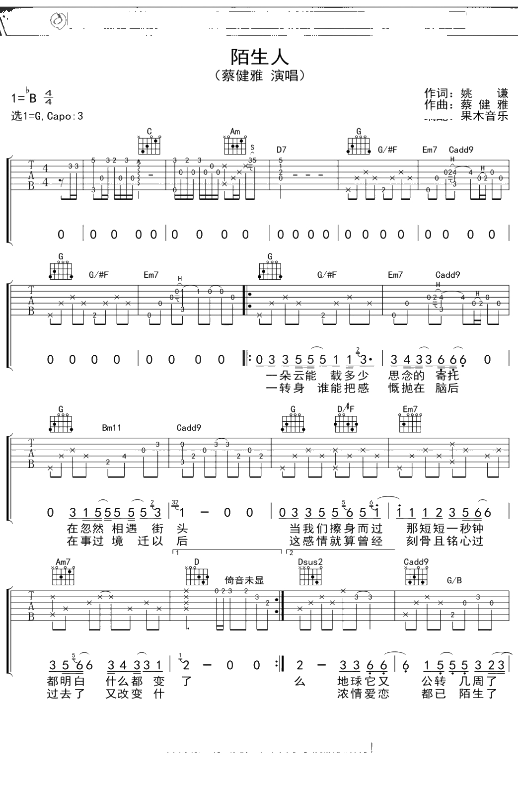 蔡健雅《陌生人》吉他谱 G调弹唱六线谱吉他谱