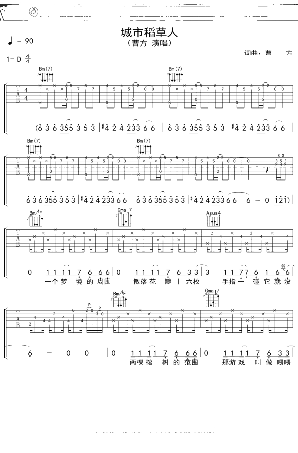 曹方《城市稻草人》吉他谱 弹唱六线谱吉他谱