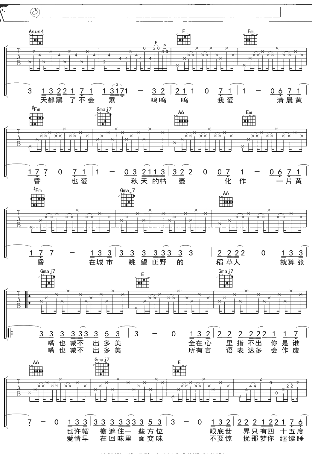 曹方《城市稻草人》吉他谱 弹唱六线谱