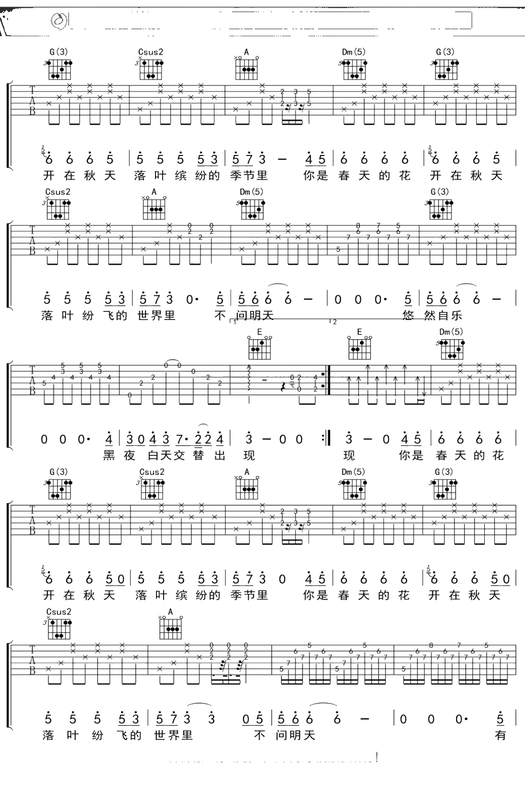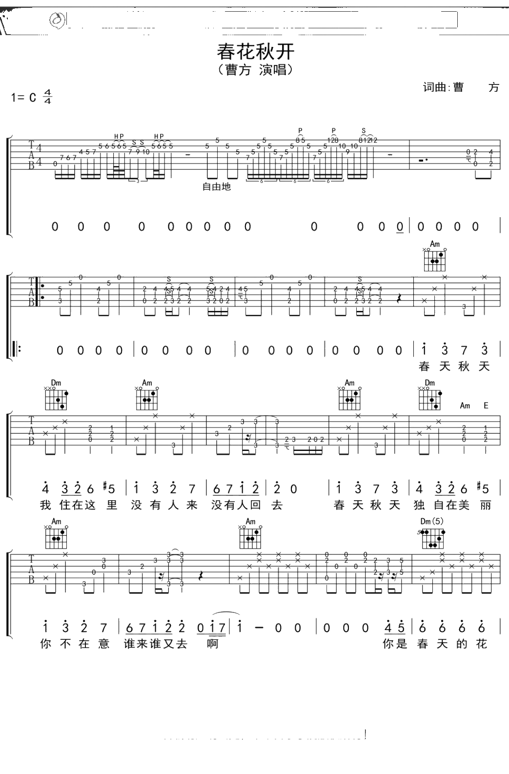 曹方《春花秋开》吉他谱 弹唱六线谱