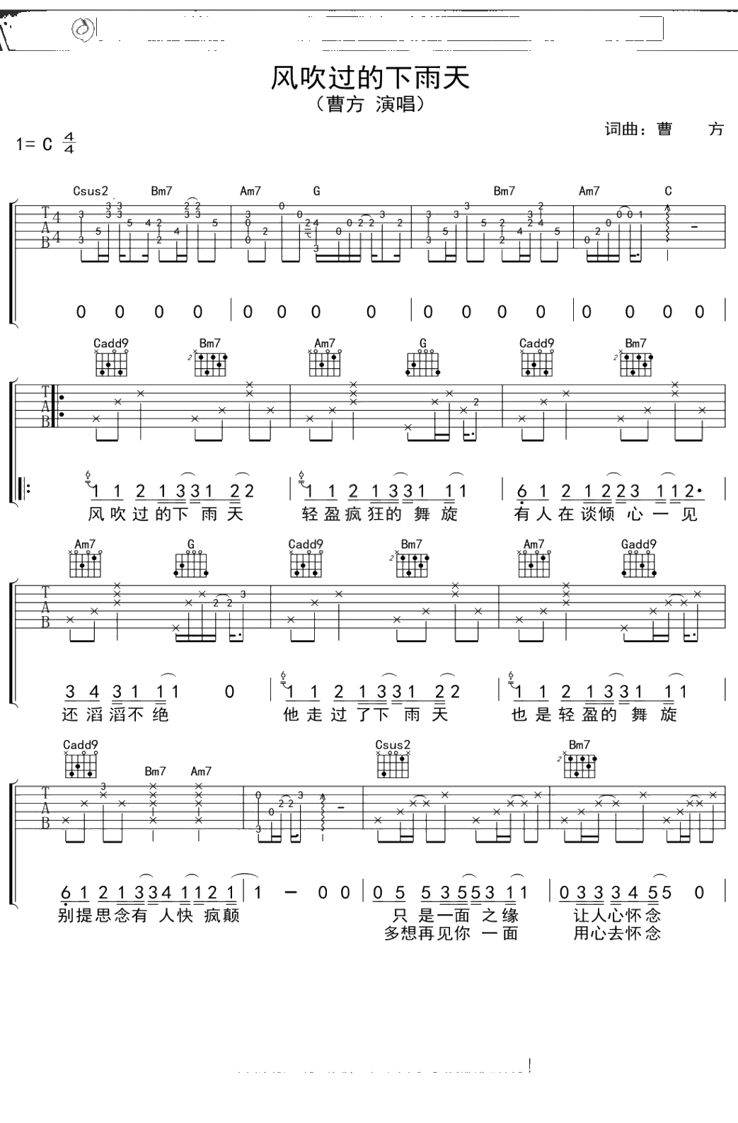 曹方《风吹过的下雨天》吉他谱 弹唱六线谱吉他谱