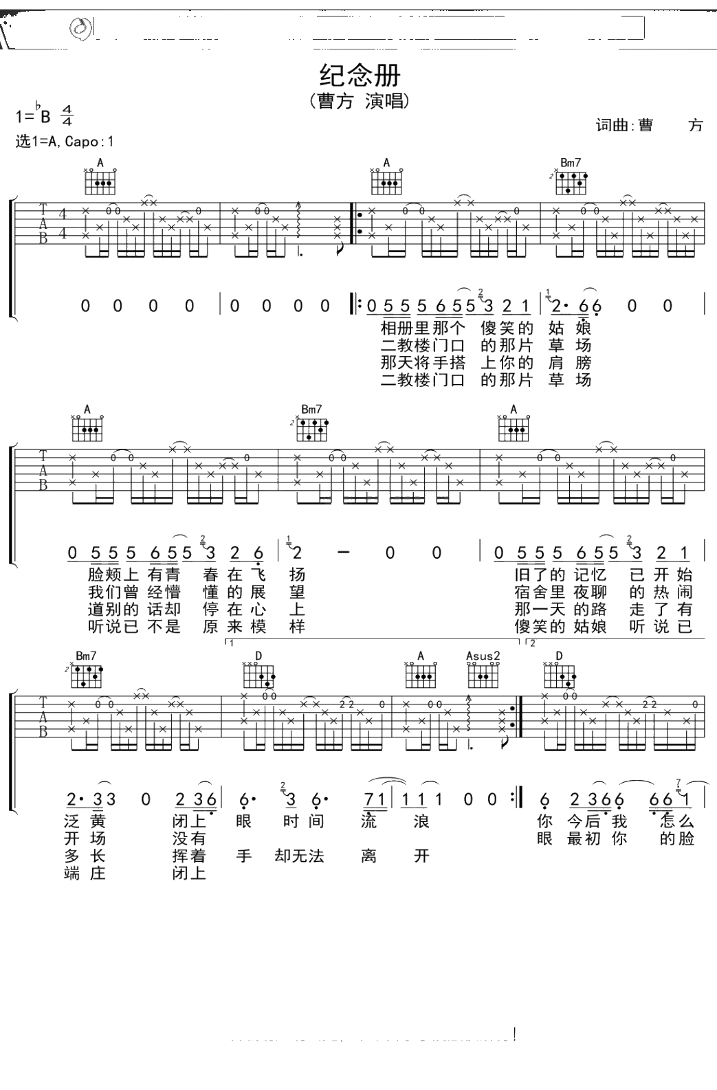 曹方《纪念册》吉他谱 弹唱六线谱