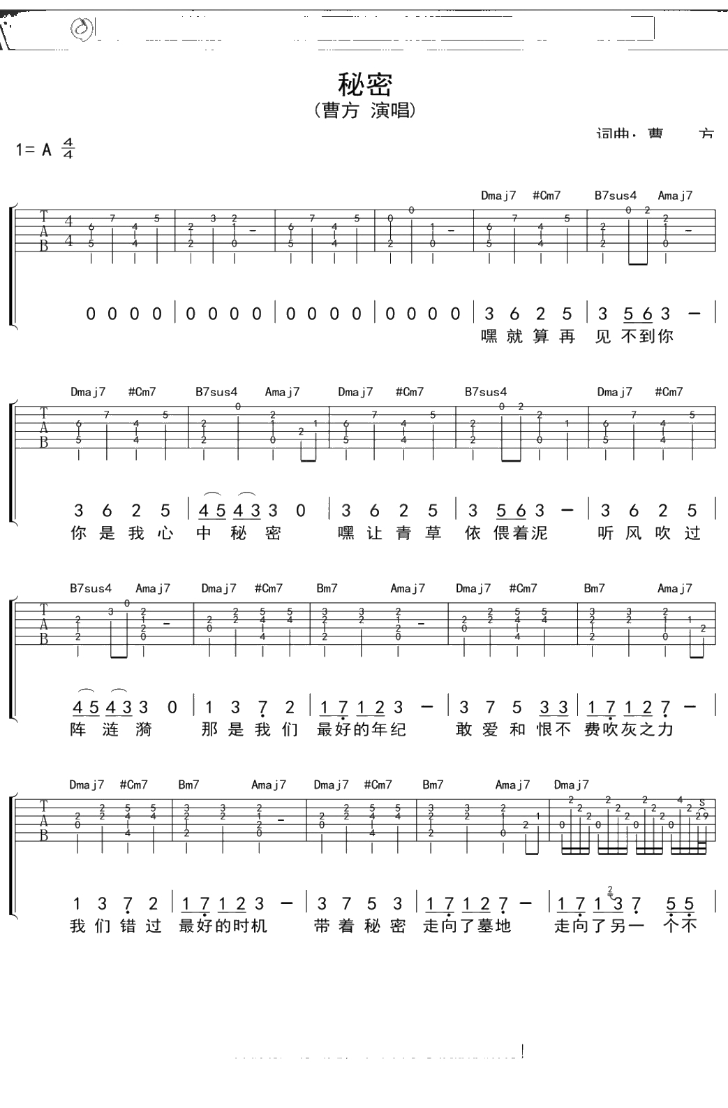 曹方《秘密》吉他谱 弹唱六线谱