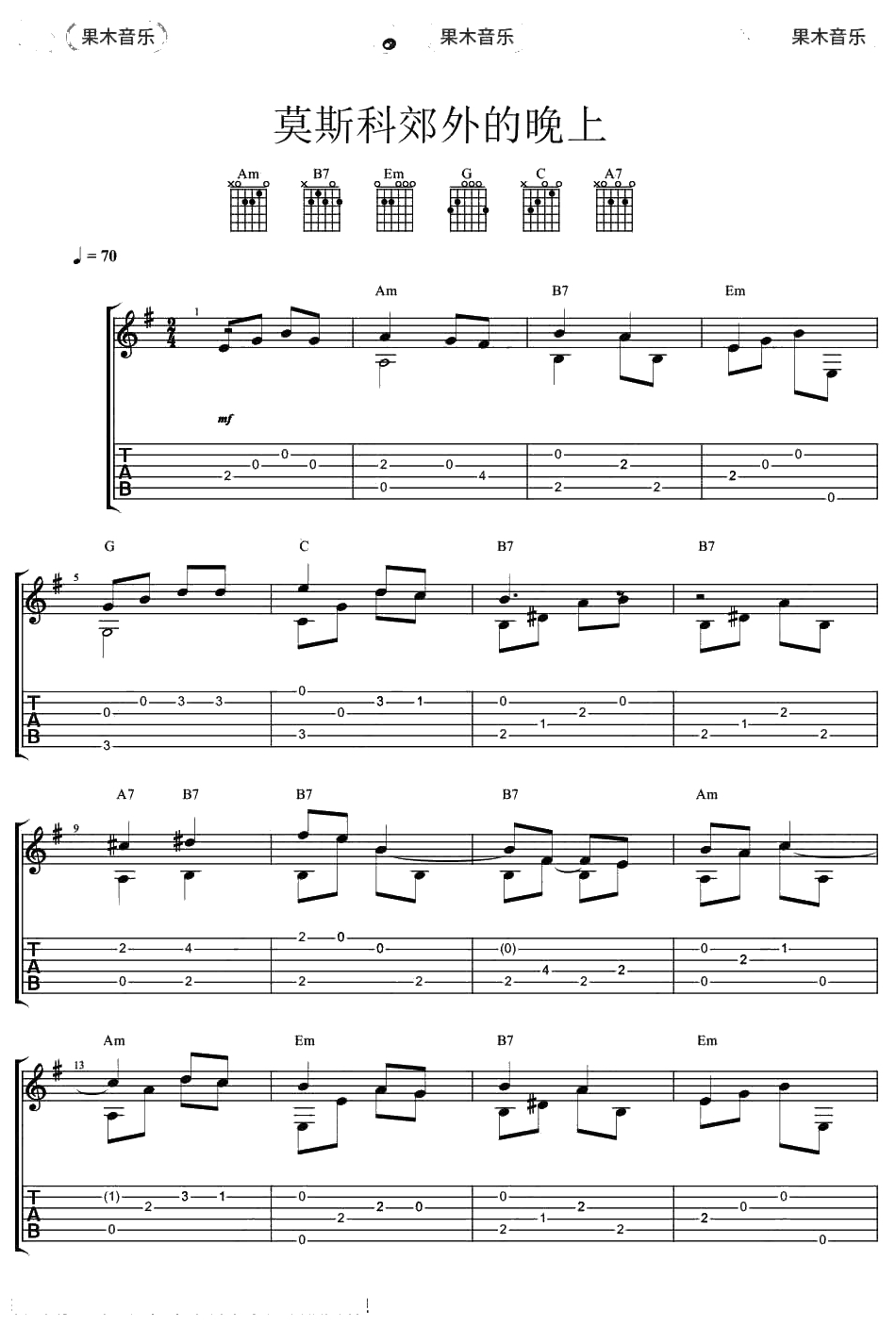 世界名曲《莫斯科郊外的晚上》指弹谱 吉他独奏