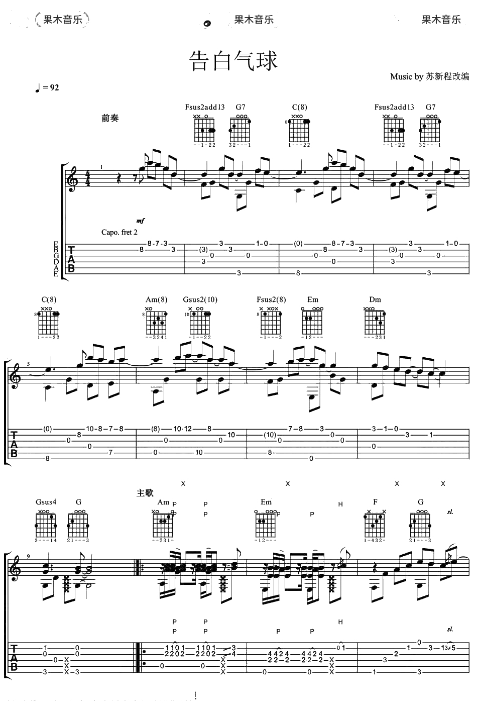 周杰伦《告白气球》指弹谱 吉他独奏吉他谱