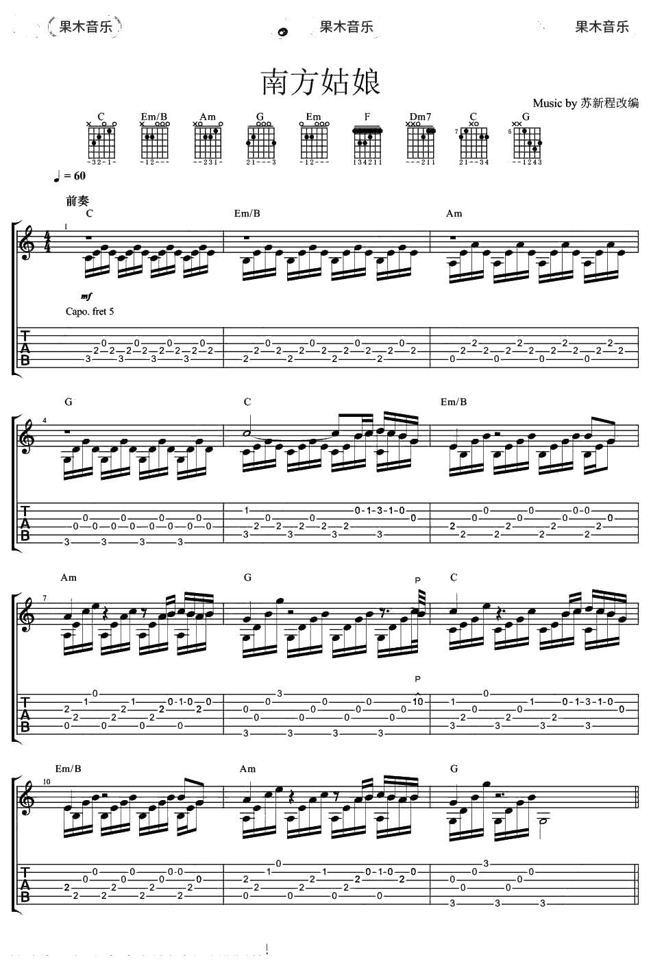 赵雷《南方姑娘》指弹谱 吉他独奏