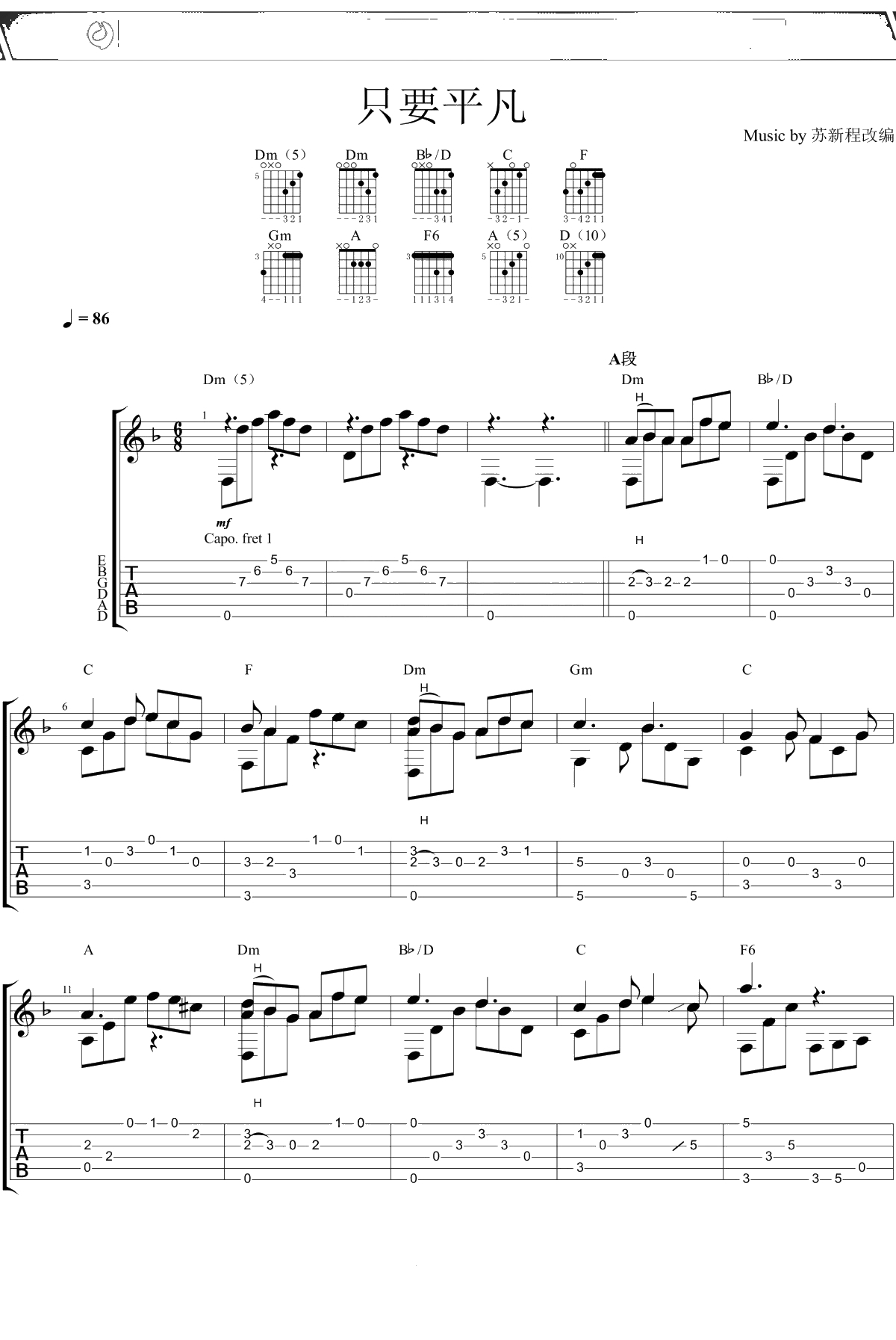 《只要平凡》指弹谱 张杰/张碧晨
