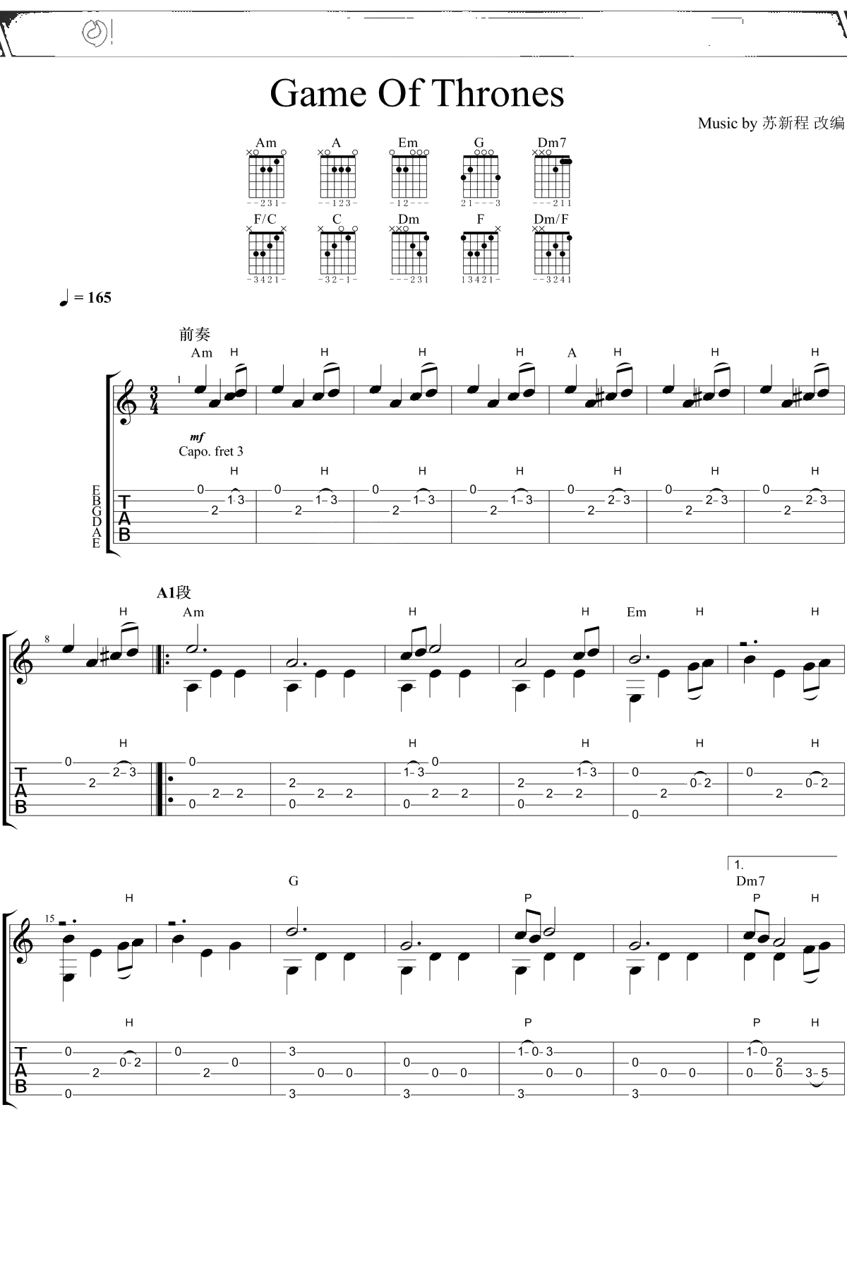 《权利的游戏》主题曲指弹吉他曲谱简单好听3吉他谱