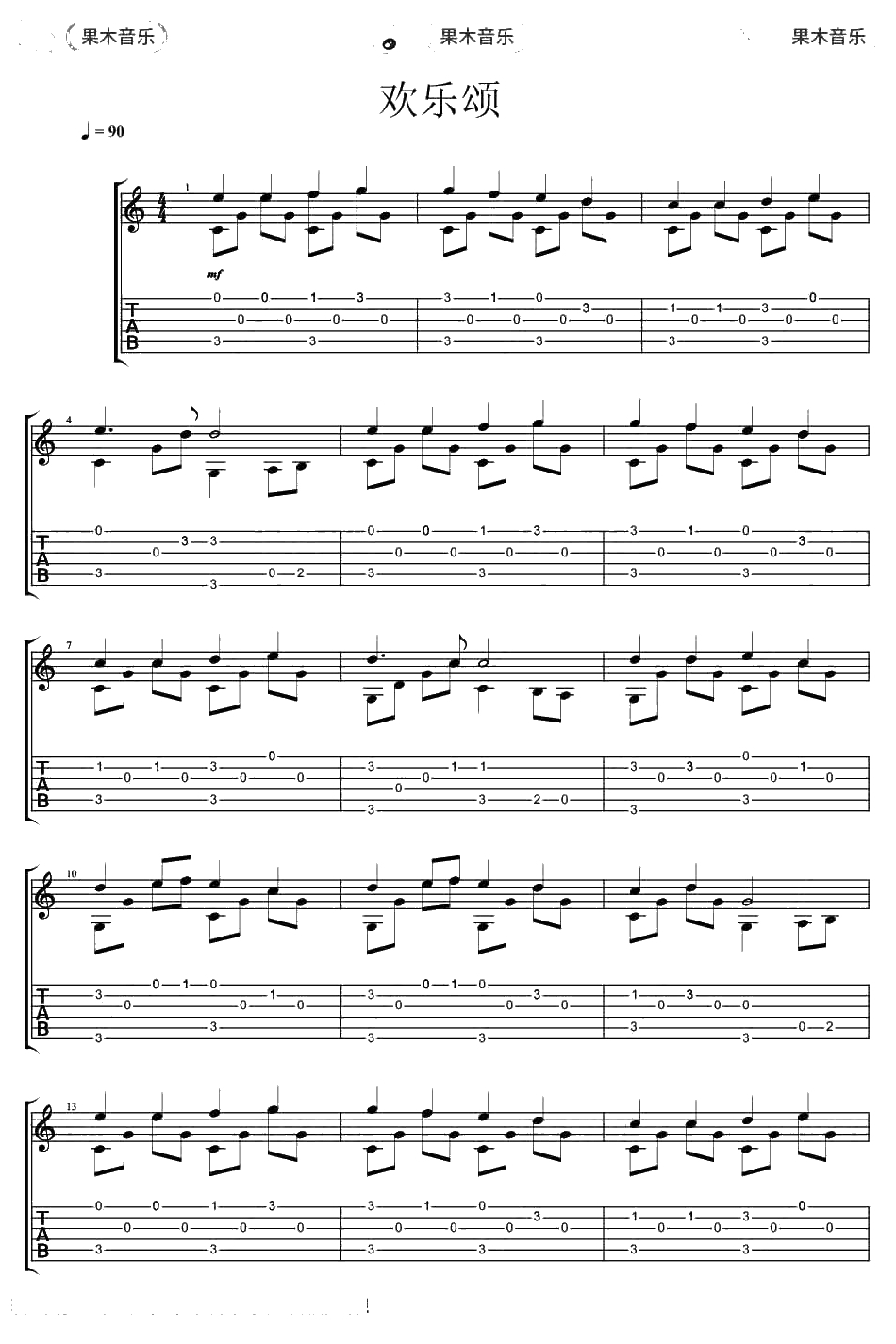 《欢乐颂》指弹吉他入门曲谱
