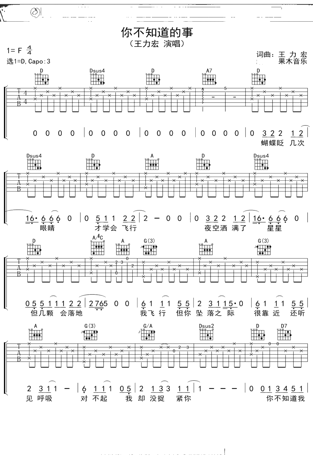 王力宏《你不知道的事》吉他谱 弹唱六线谱