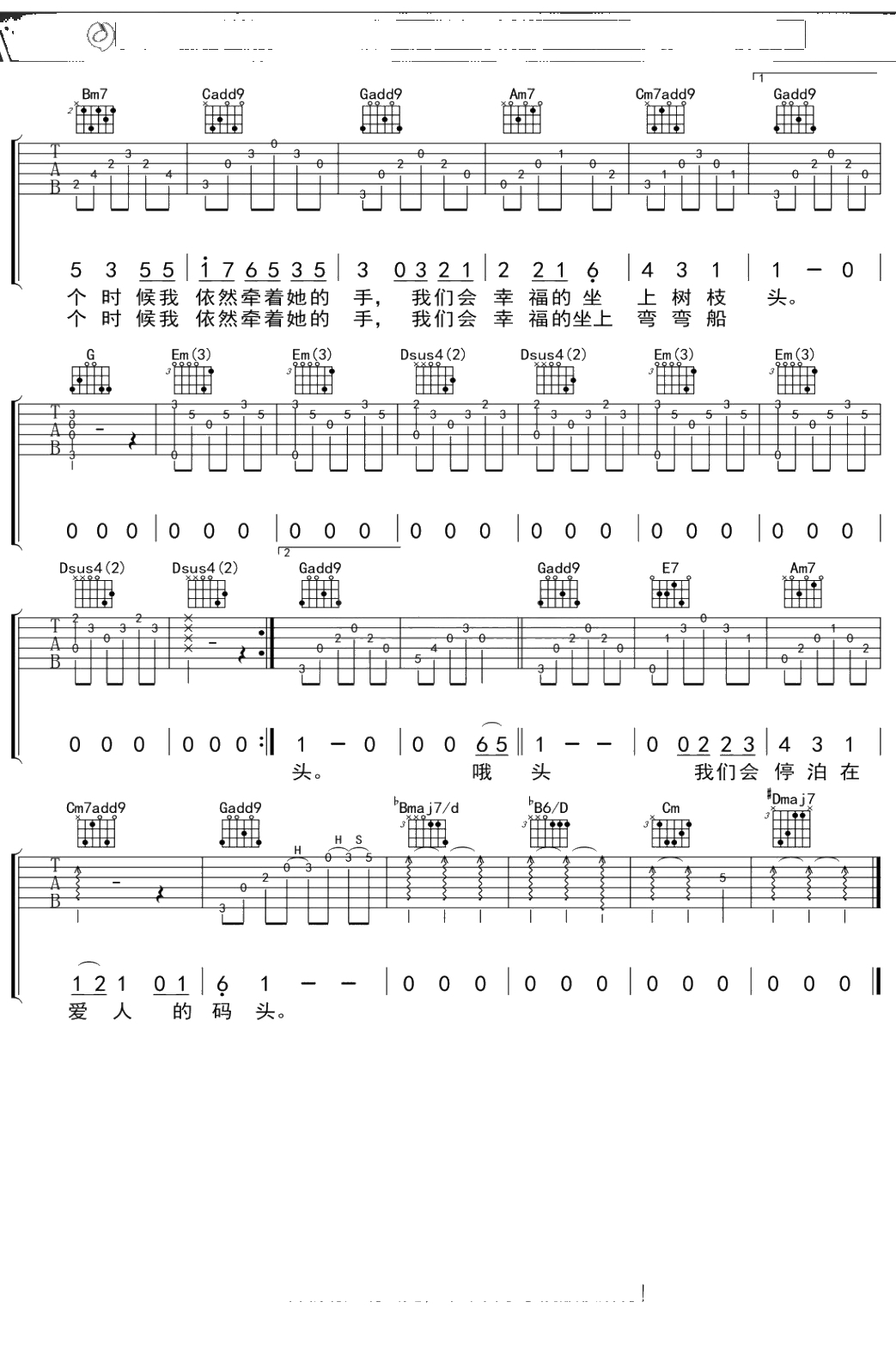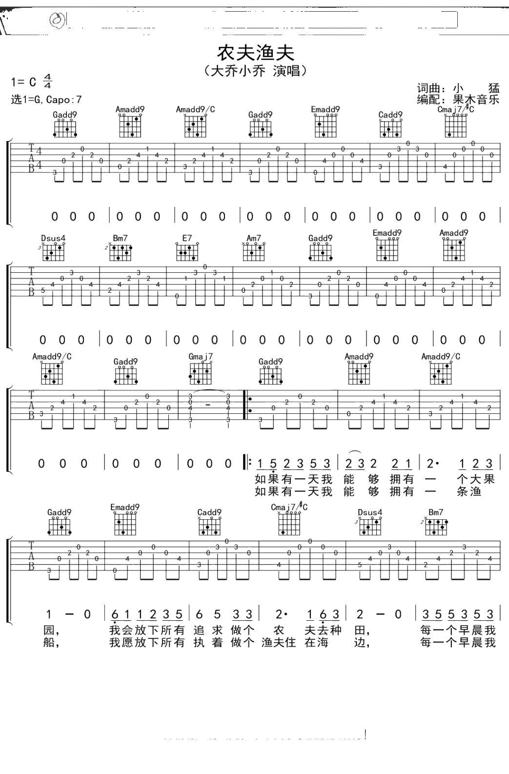 大乔小乔《农夫渔夫》吉他谱 弹唱六线谱