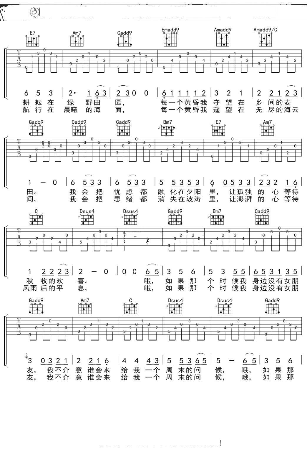 大乔小乔《农夫渔夫》吉他谱 弹唱六线谱吉他谱