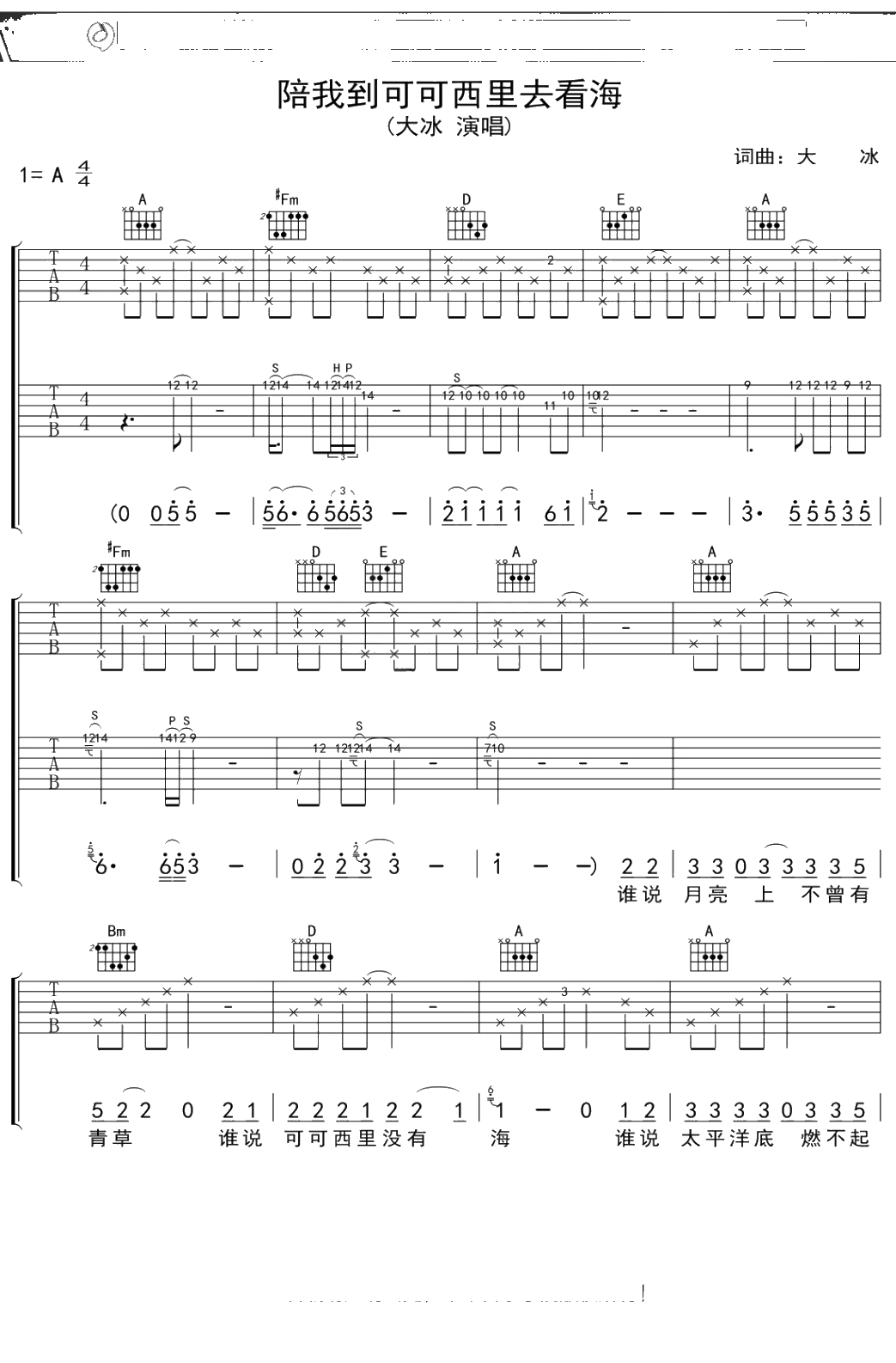 大冰《陪我到可可西里去看海》吉他谱 弹唱六线谱吉他谱
