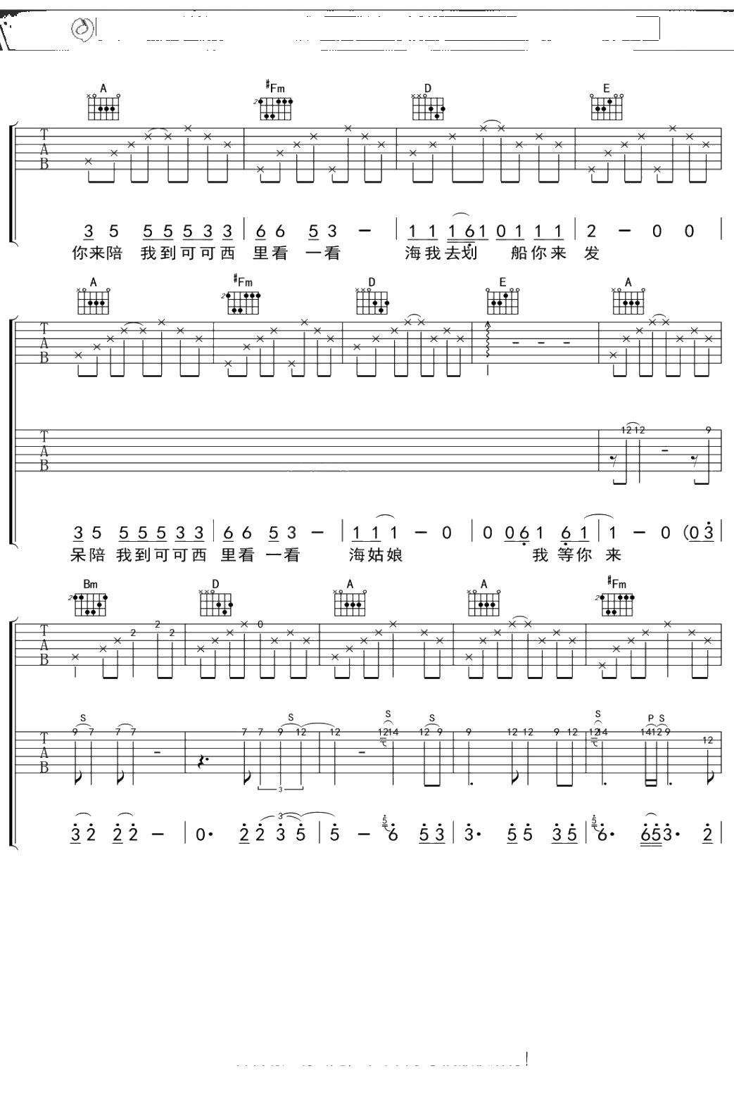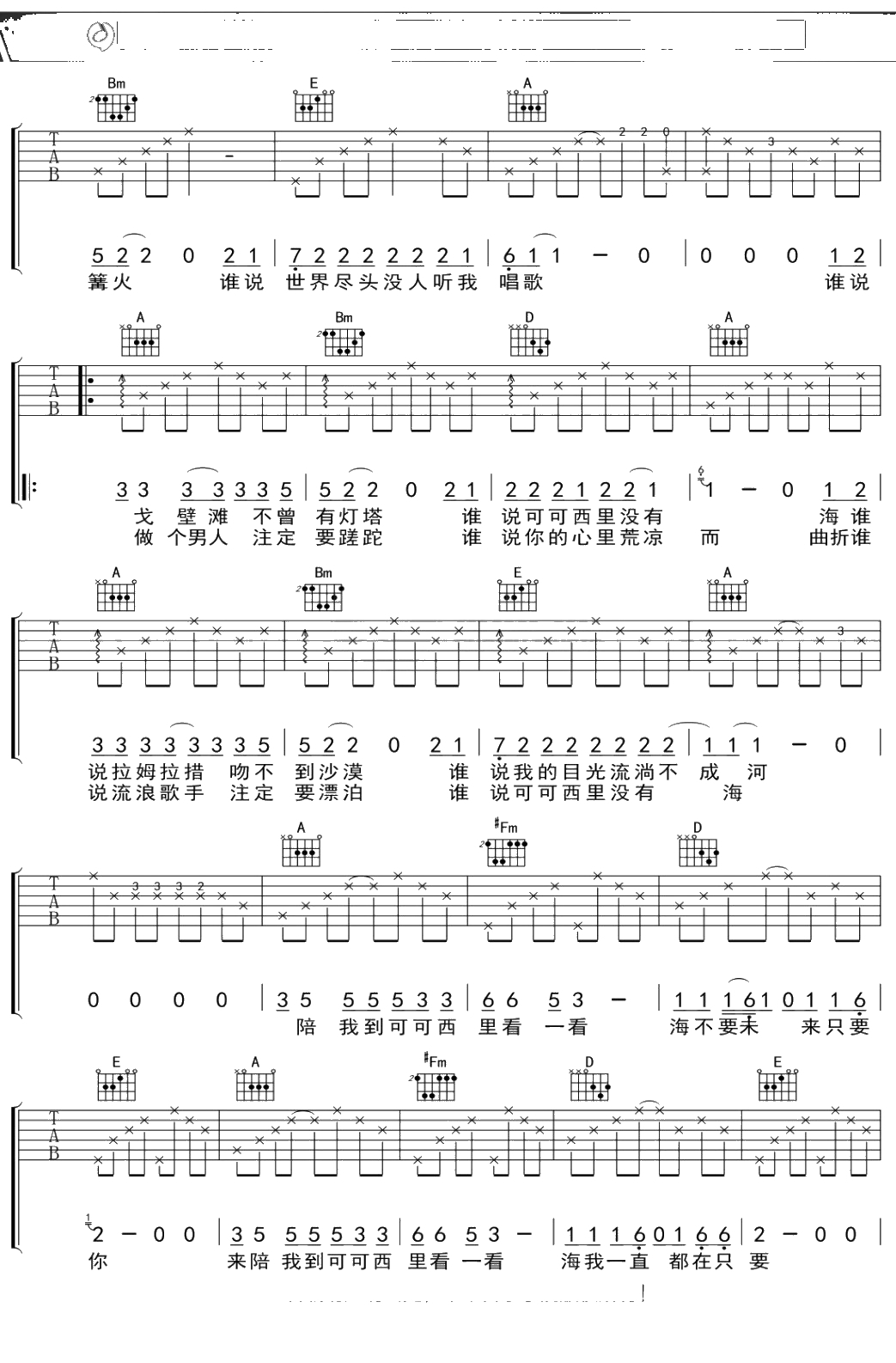 大冰《陪我到可可西里去看海》吉他谱 弹唱六线谱