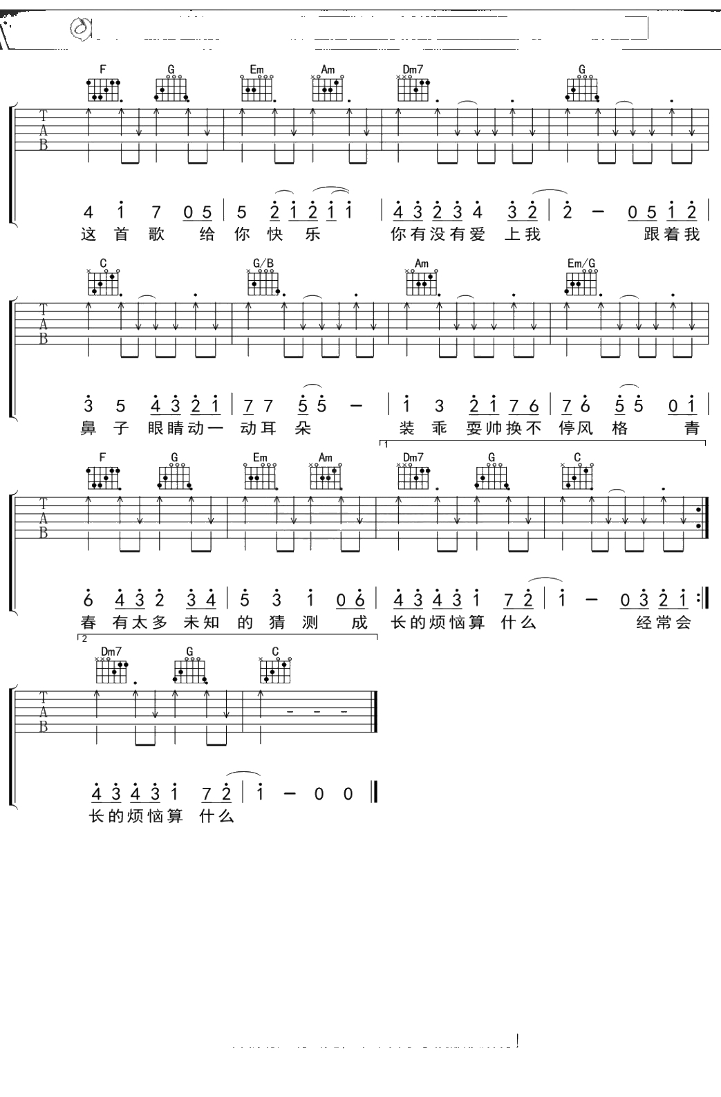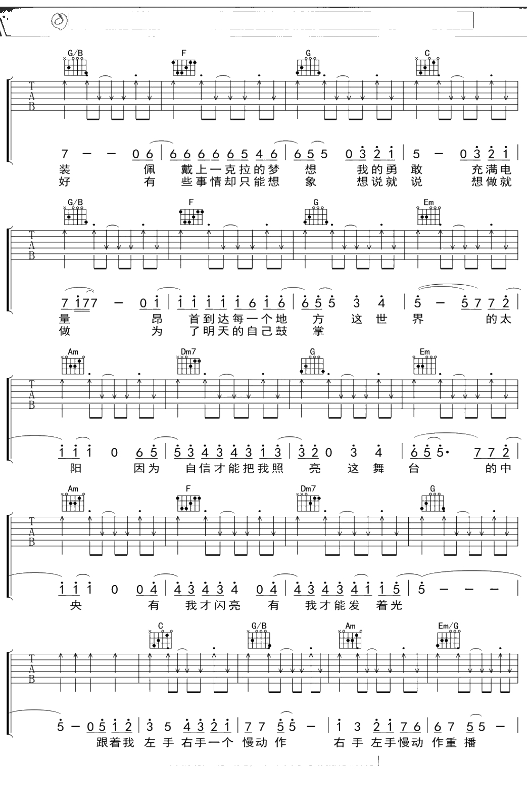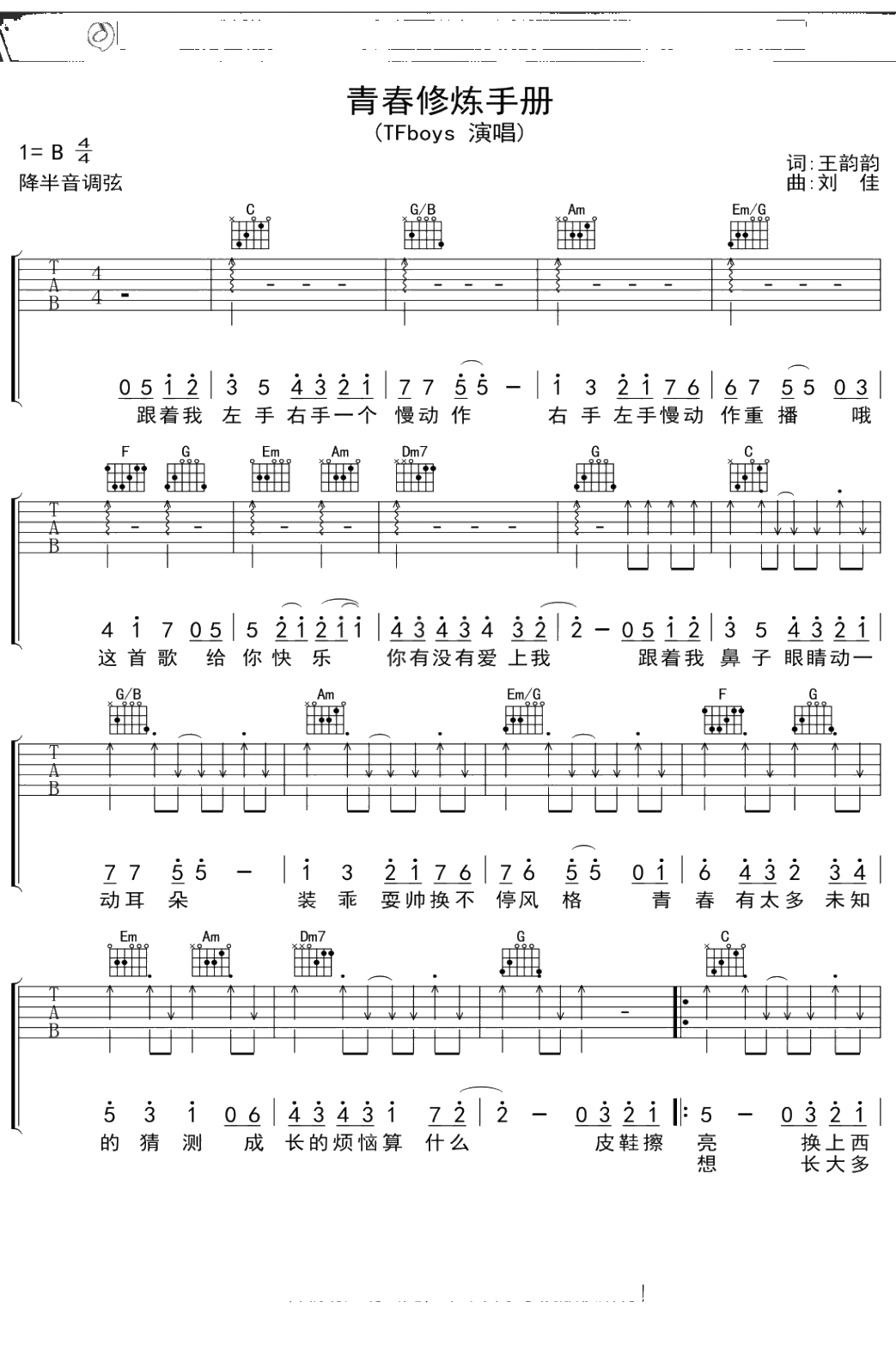 TFboys《青春练习手册》吉他谱 弹唱六线谱
