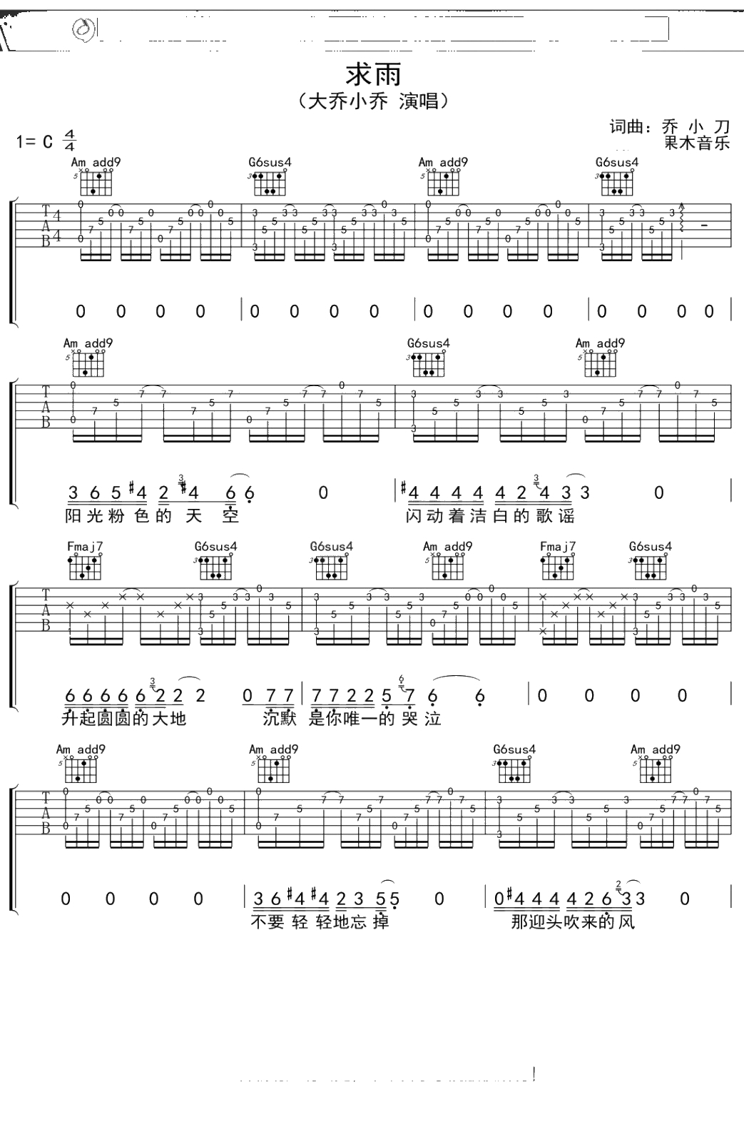 大乔小乔《求雨》吉他谱 弹唱六线谱