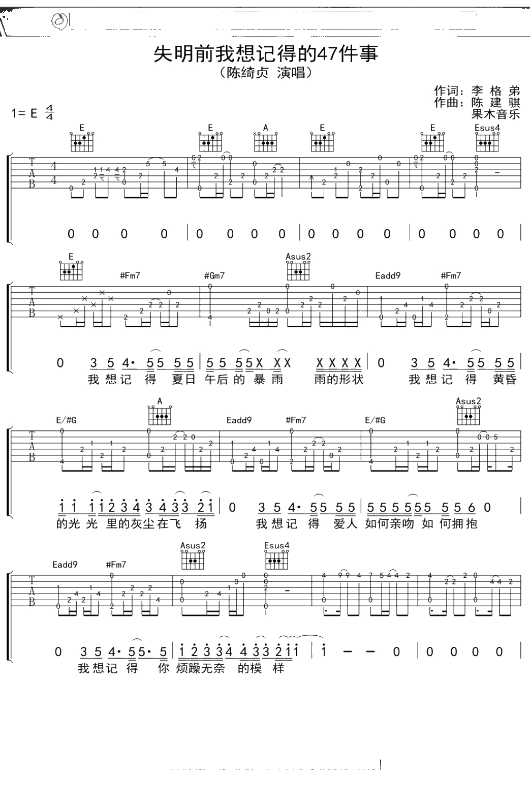 陈绮贞《失眠前我记得的47件事》吉他谱 弹唱六线谱