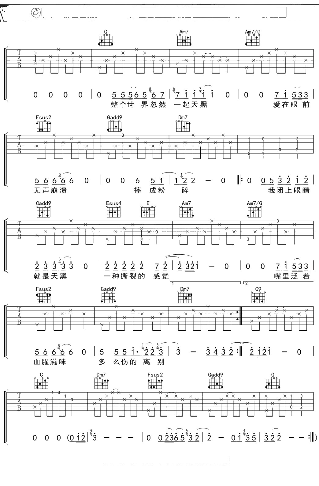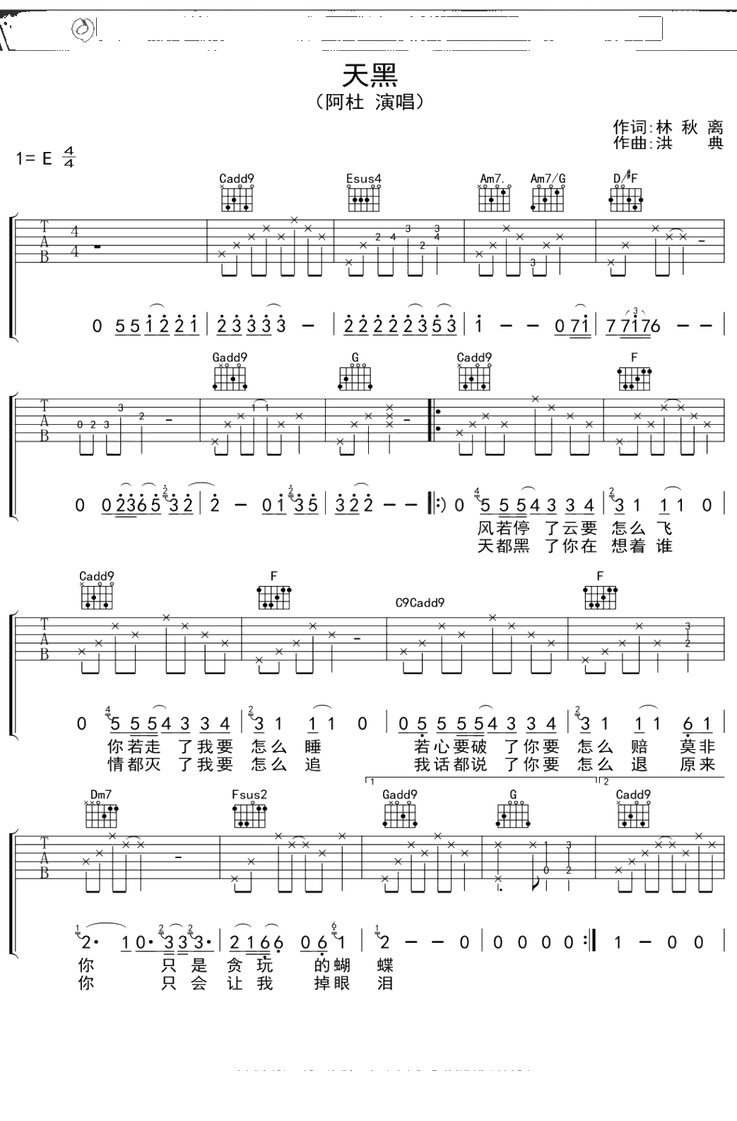 阿杜《天黑》吉他谱 弹唱六线谱