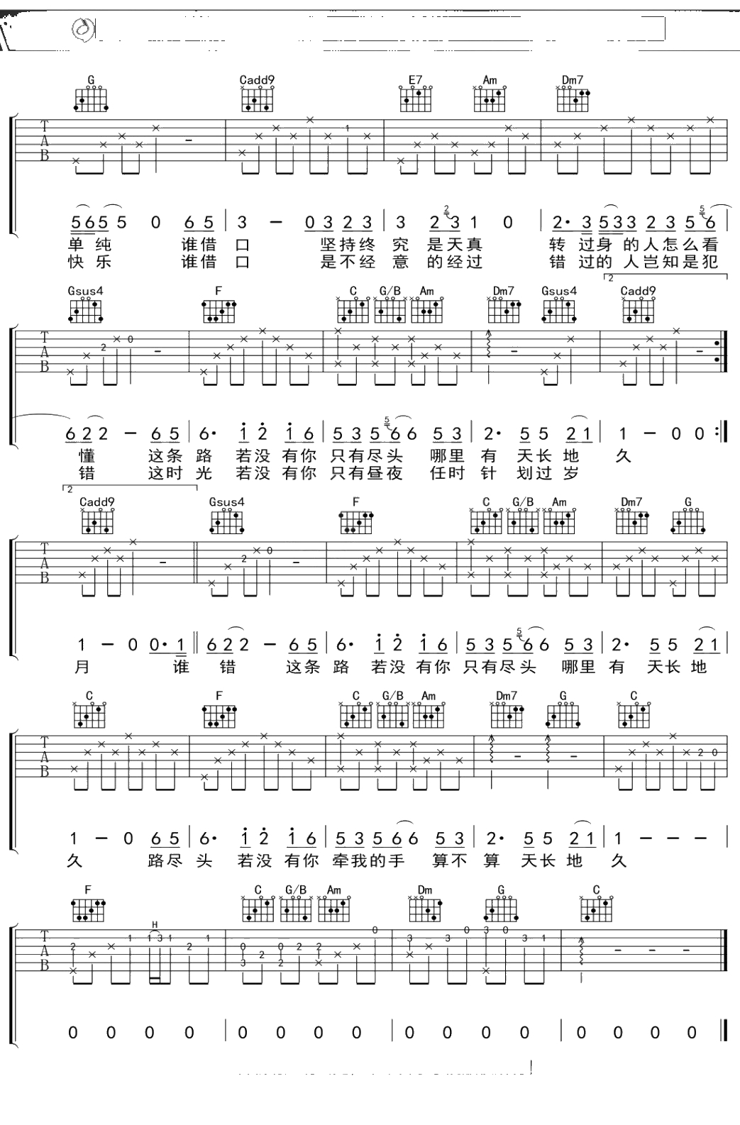 陈楚生《天长地久》吉他谱 弹唱六线谱吉他谱