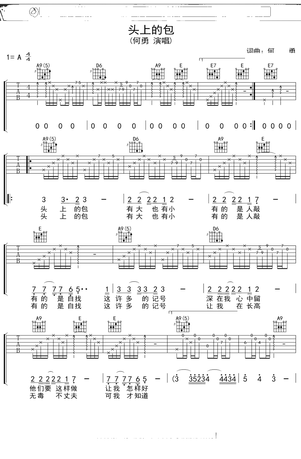 何勇《头上的包》吉他谱 弹唱六线谱