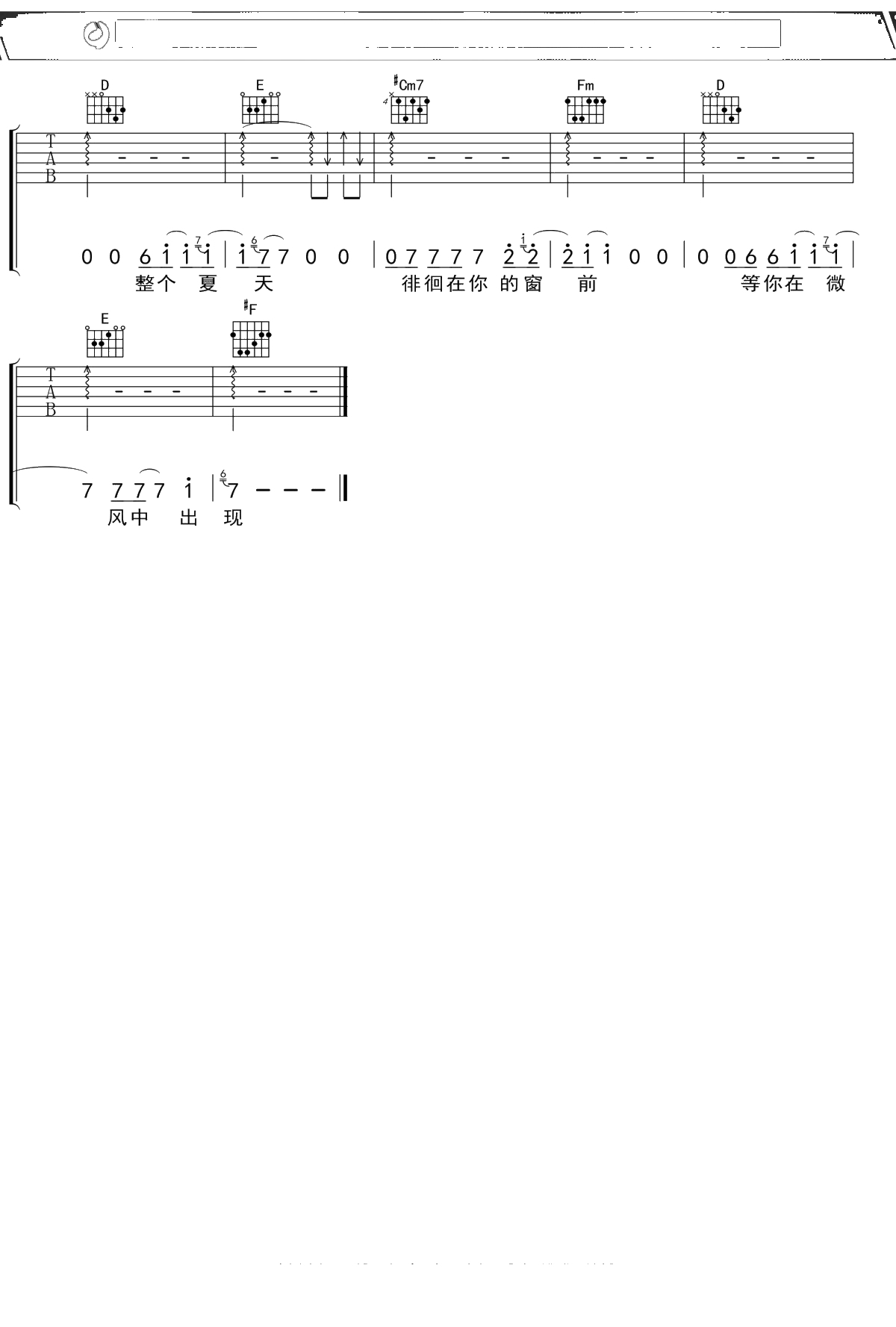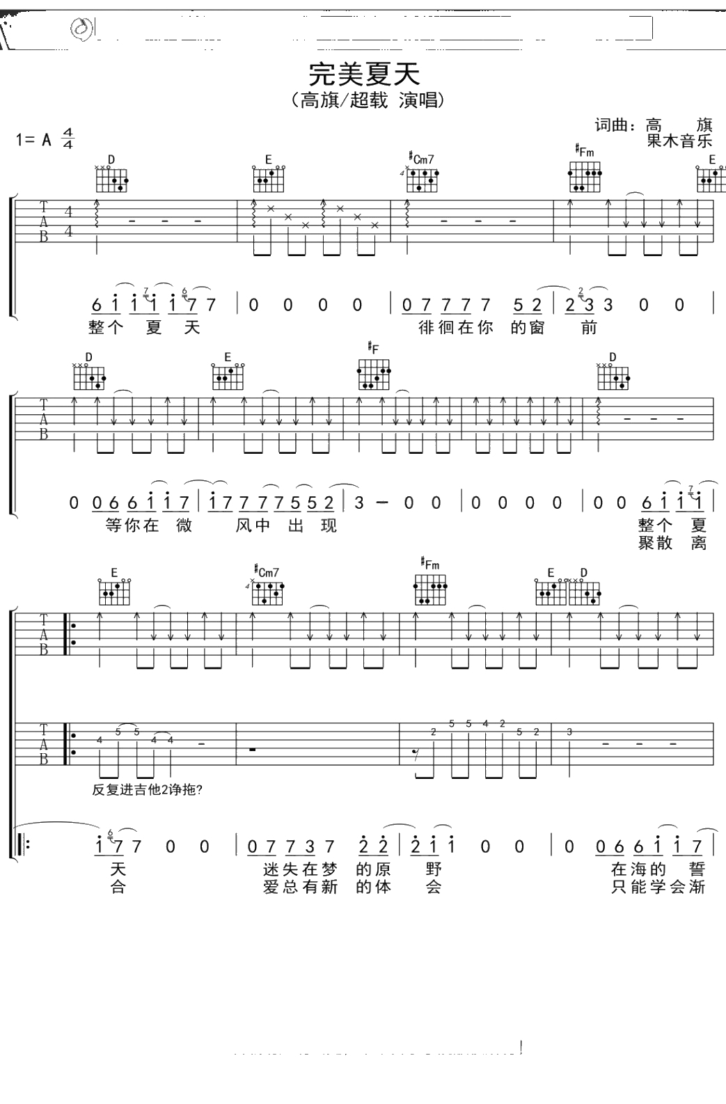 超载乐队《完美夏天》吉他谱 弹唱六线谱