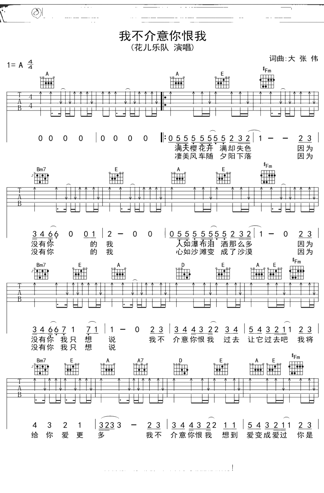 花儿乐队《我不介意你恨我》吉他谱 弹唱六线谱吉他谱