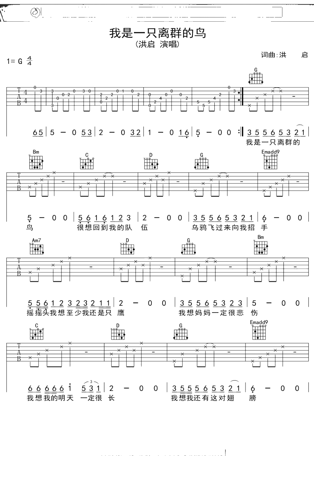 洪启《我是一只离群的鸟》吉他谱 弹唱六线谱