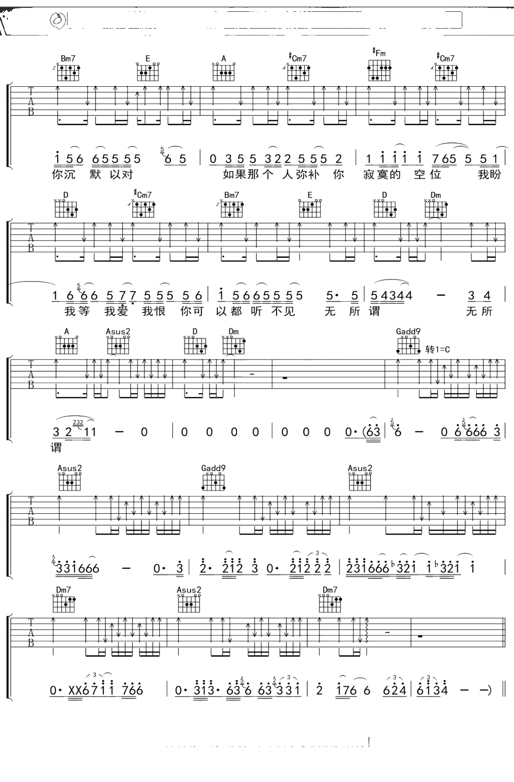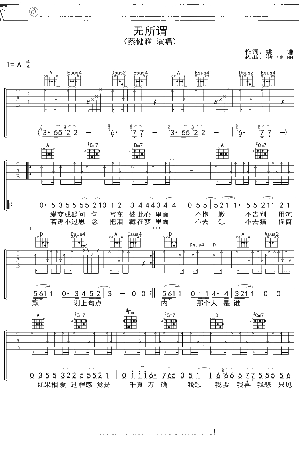 蔡健雅《无所谓》吉他谱 弹唱六线谱吉他谱
