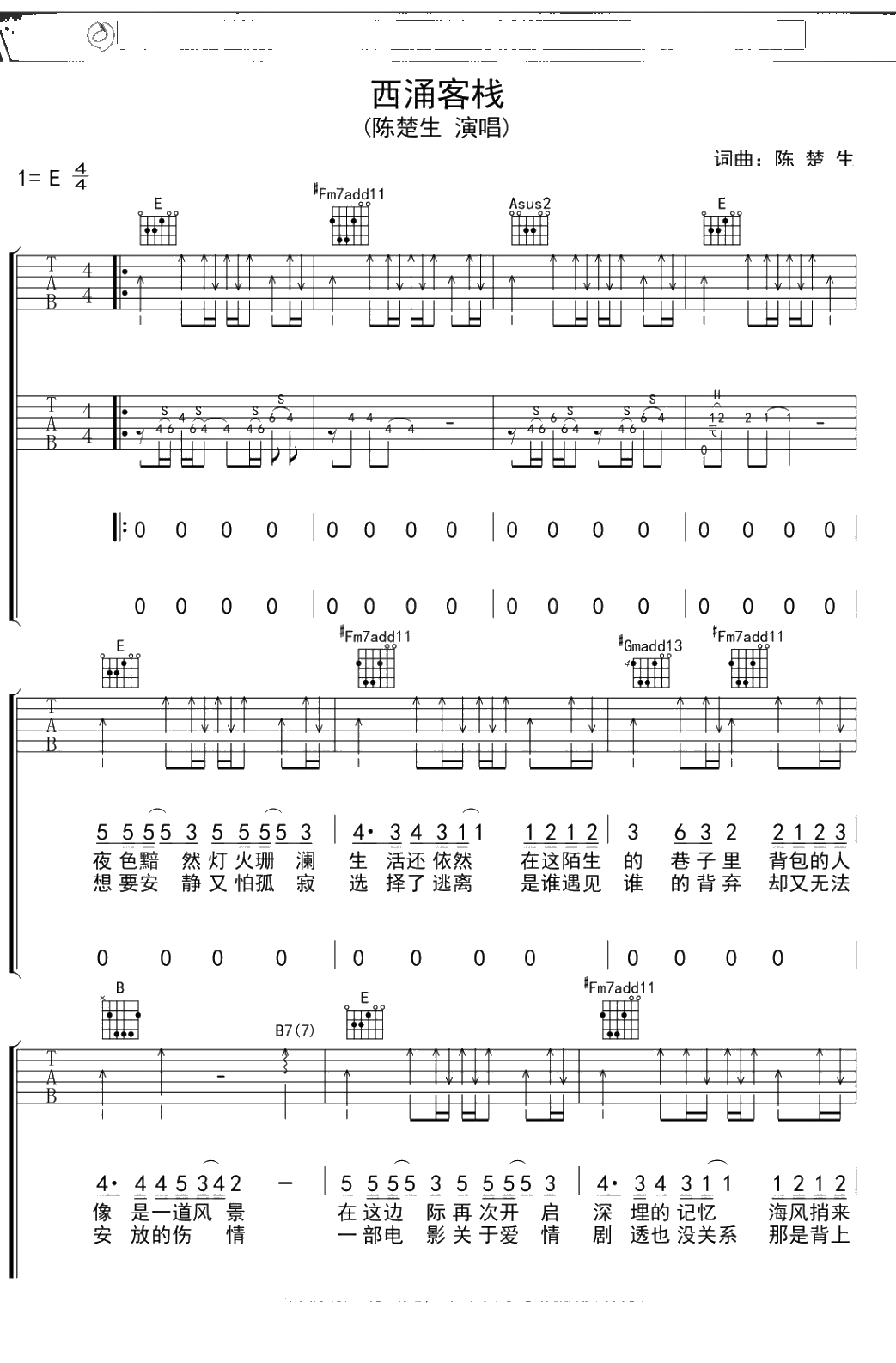 陈楚生《西涌客栈》吉他谱 弹唱六线谱