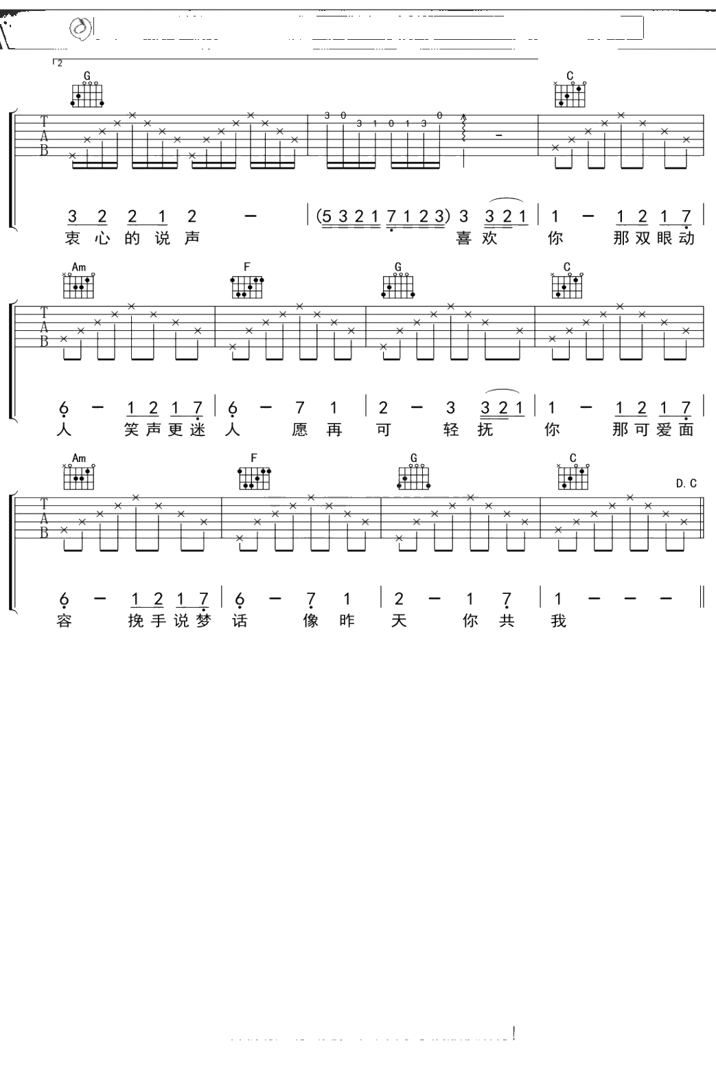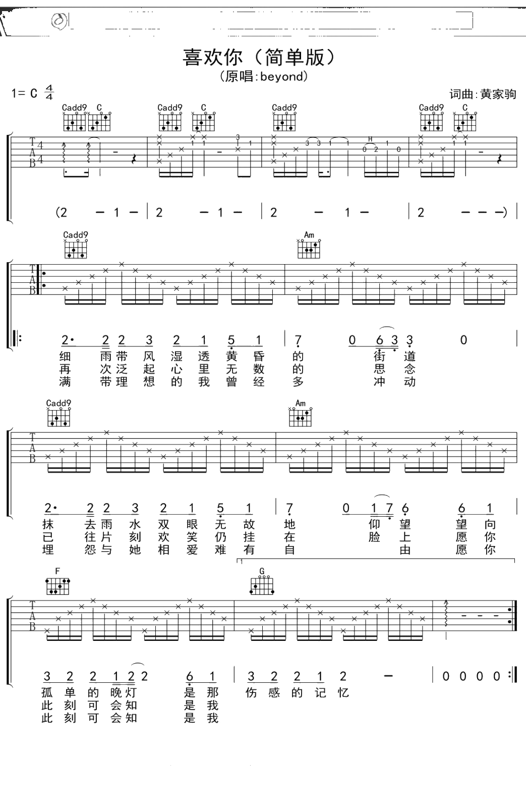 beyond《喜欢你》简单版吉他谱 弹唱六线谱